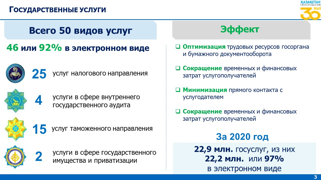 Министерством физическим и юридическим лицам оказывается 50 видов государственных услуг, из них 46 или 92% оказываются в электронном виде. Всего в 2020 году оказано 22,9 млн государственных услуг, в том числе 22,2 млн или 97% в электронном виде.
