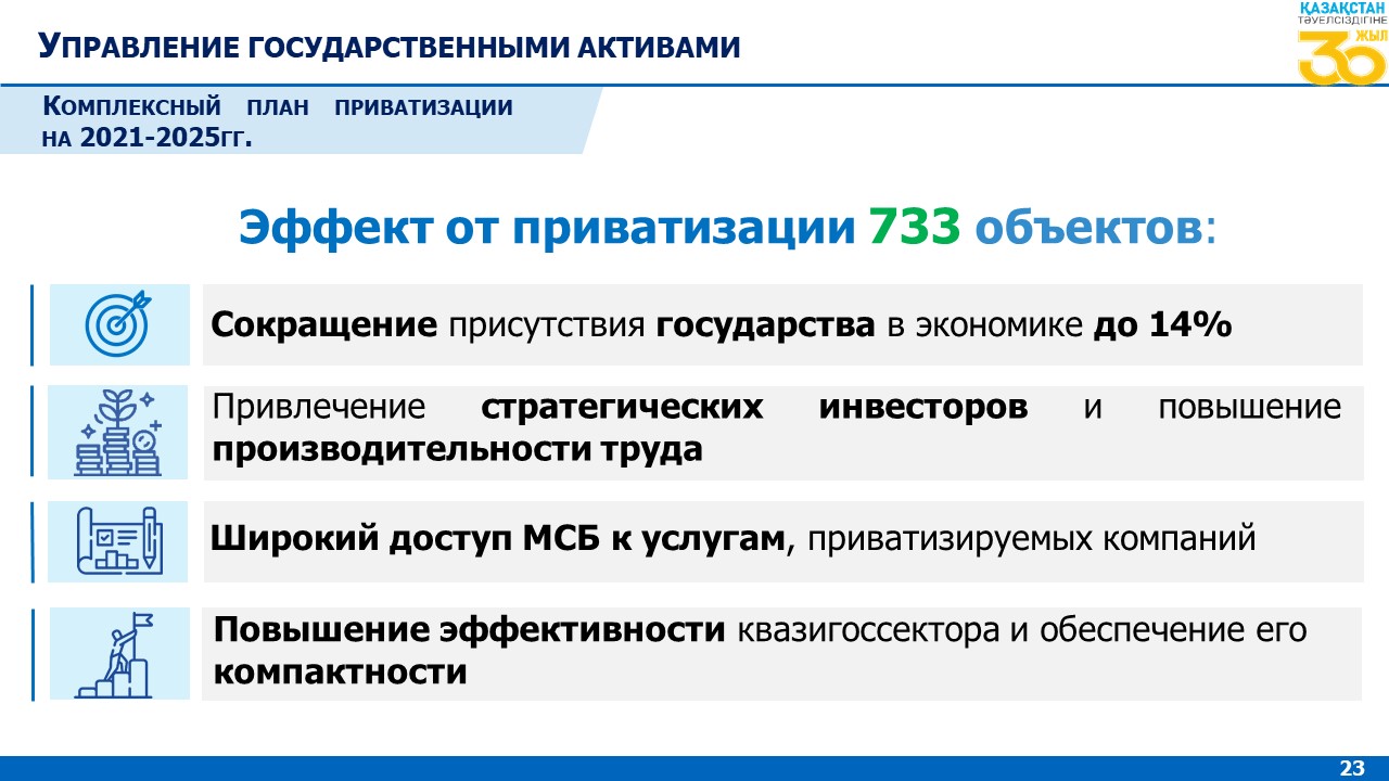 Третье. Для повышения эффективности управления госактивами будет продолжена приватизация в рамках нового Комплексного плана на 2021-2025 годы. Предусматривается реализация 733 объектов госсобственности и квазигосударственного сектора.