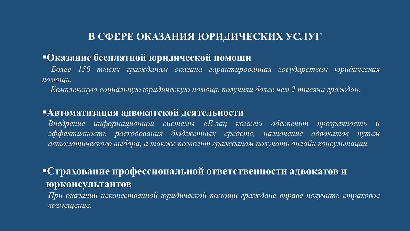 Для этого внедрена информационная система «Е-заң көмегі», где назначение адвокатов будет осуществляться путем автоматического выбора, а также позволит гражданам посредством этой системы получать онлайн консультации.