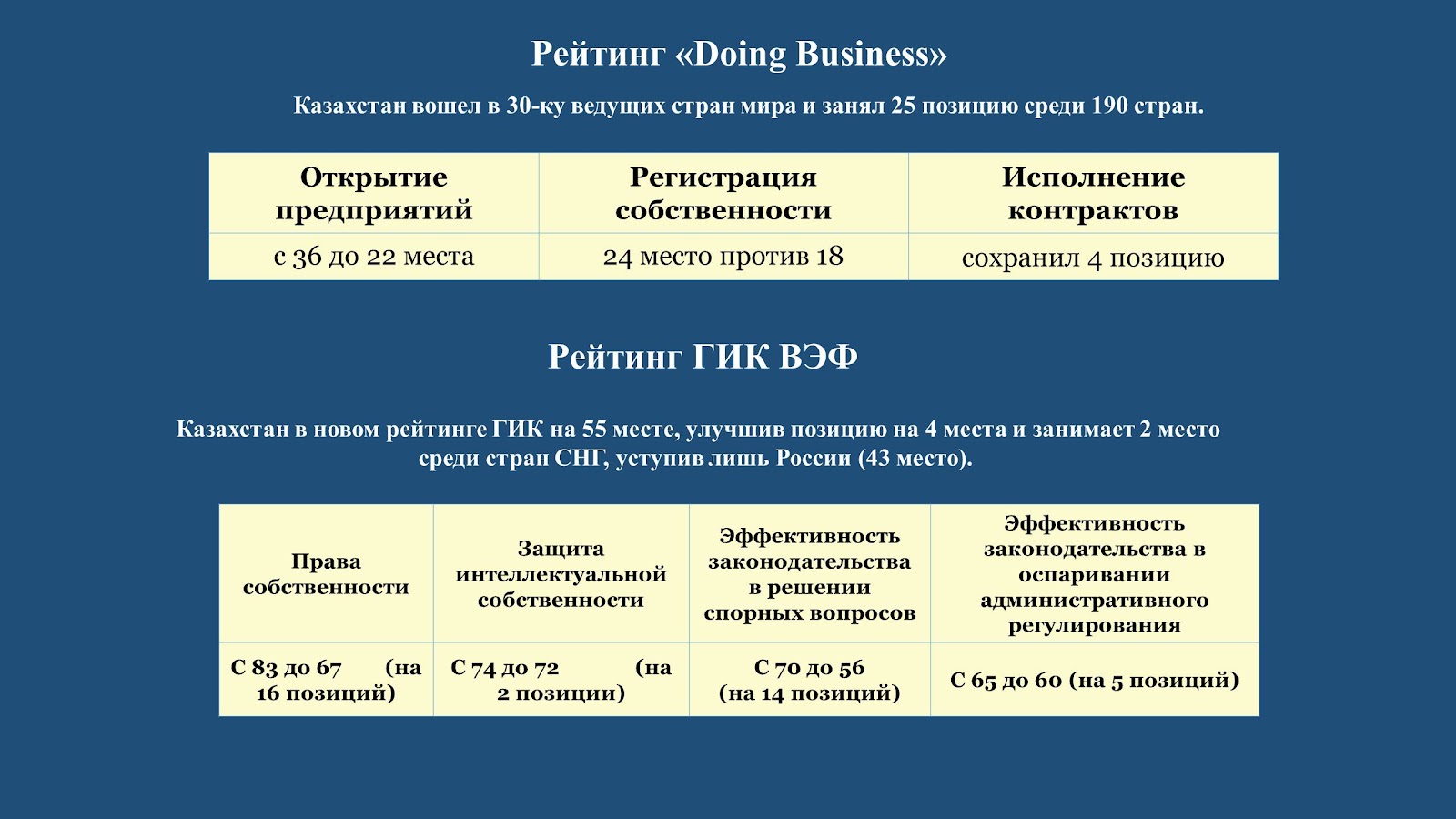 В рейтинге «Doing Business» Казахстан вошел в 30-ку ведущих стран мира и занял 25 позицию среди 190 стран.