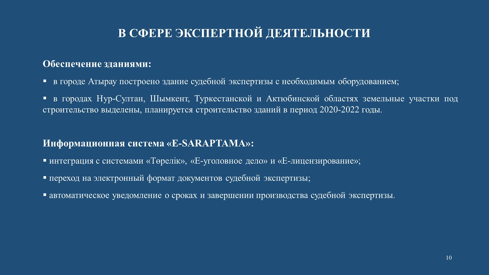Министерством разработана информационная система «Е-saraptama». Проведена работа по ее интеграции с информационными системами «Төрелік», «Е-уголовное дело» и «Е-лицензирование». Запуск в промышленную эксплуатацию планируется в текущем году.