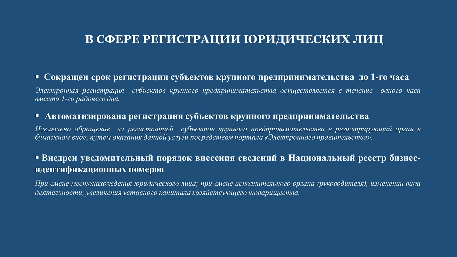 Как известно, регистрация коммерческих организаций, относящихся к субъектам малого и среднего бизнеса, в течение ряда лет осуществляется в электронном формате, срок регистрации составляет 1 час. Также с этого года в электронный формат переведена регистрация субъектов крупного предпринимательства. Ежегодно этой услугой пользовались в среднем 1200 юридических лиц.