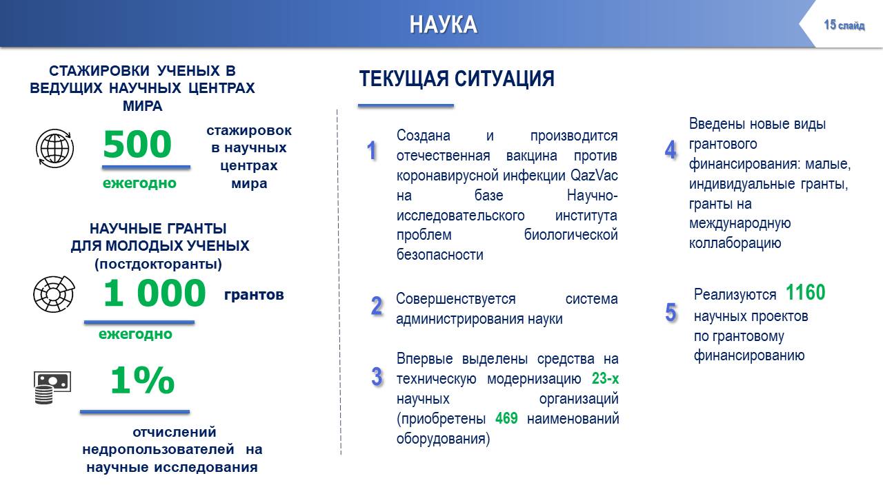Хорошие возможности открываются и для отечественных ученых. Так, 500 научных сотрудников смогут пройти международные стажировки. Проект планируется реализовывать через программу «Болашак». Таким образом казахстанские научные работники будут иметь возможность получать опыт не только в высших учебных заведениях, но и в научных организациях.