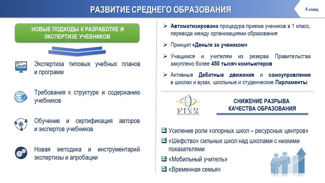 Перед министерством стоят новые задачи — это сертификация выпускников. В 2021 году выпускники будут проходить сертификацию на профпригодность, также в планах к 2025 году увеличить заработную плату учителей в 2 раза, на 30-50% производить доплаты за квалификационные категории педагогам.