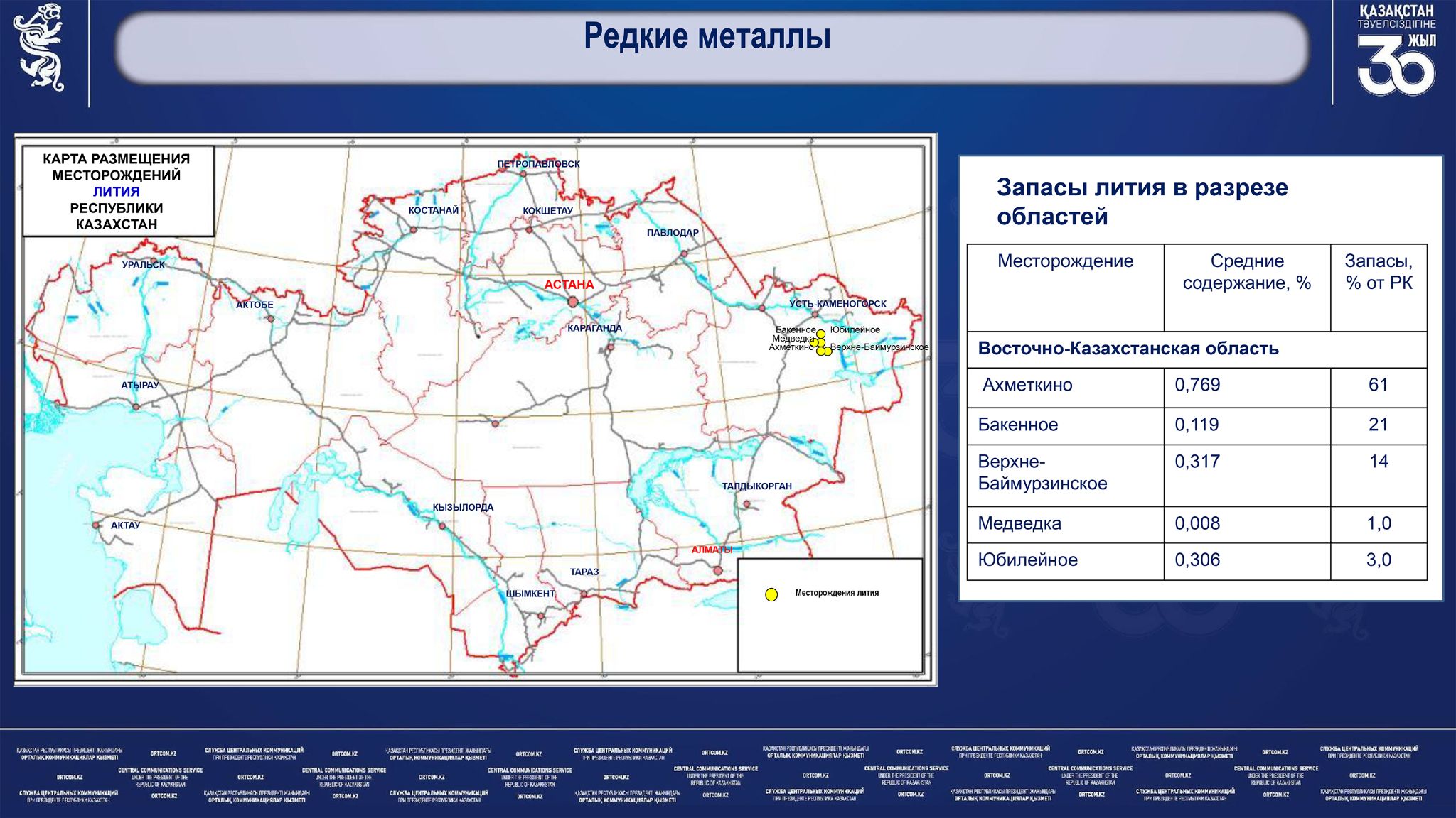 Для развития добычи и переработки редких металлов в Казахстане в 2021 году переутверждены Ведомственные перечни сведений, подлежащих засекречиванию. Из перечня исключены сведения о балансовых запасах лития, цезия, галлия, тантала-ниобия. Отныне эти сведения не являются секретными. С 2020 года за счет государственного бюджета проводятся поисковые работы на редкие металлы на участках Кара-Аяк, Мунча в Восточно-Казахстанской области.
