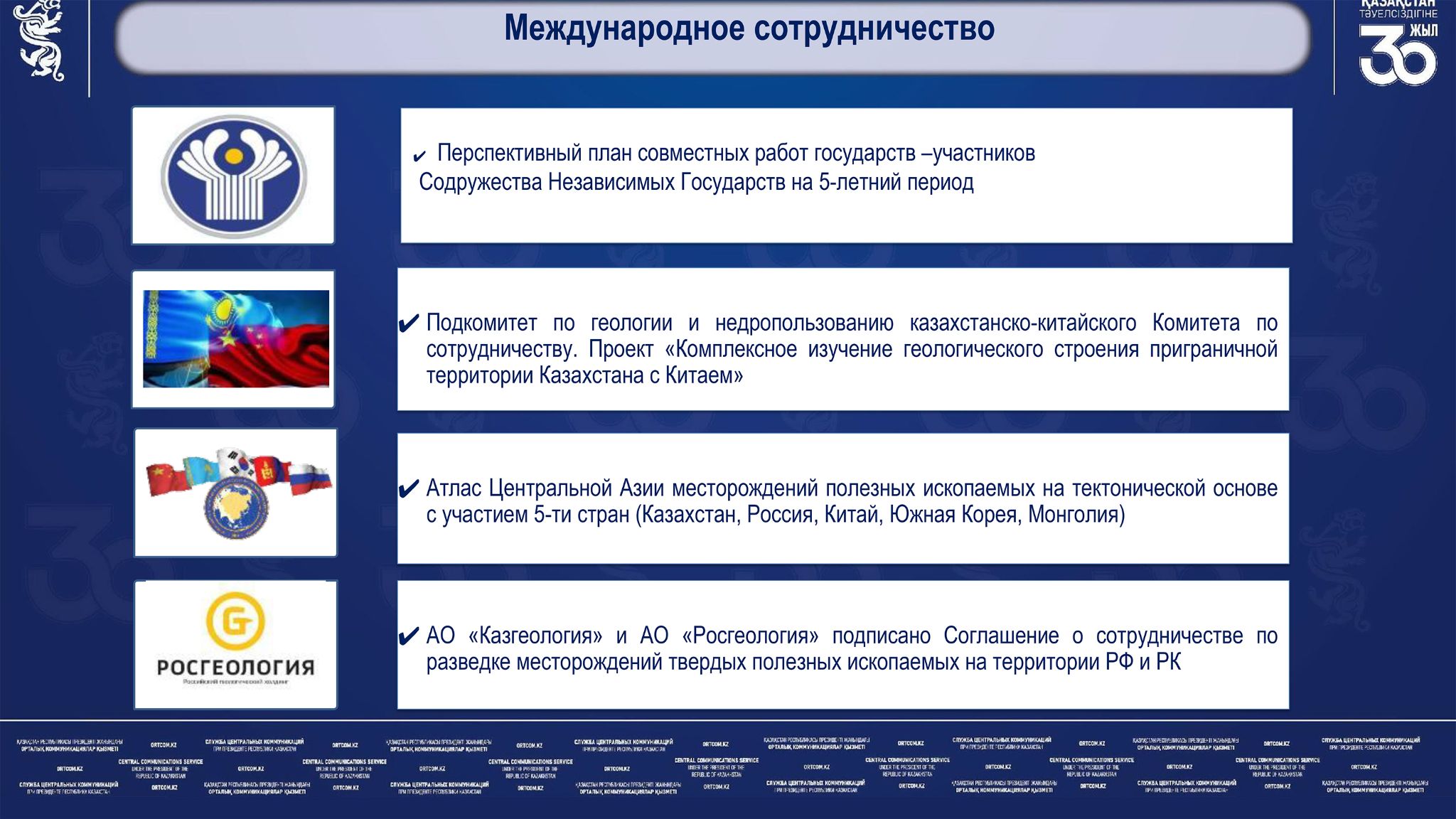 Планомерная работа проводится в рамках Подкомитета по геологии и недропользованию казахстанско-китайского комитета по сотрудничеству. Создана рабочая группа с участием 5 стран (Казахстан, Россия, Корея, Монголия, Китай) по геологическому изучению приграничных территорий.