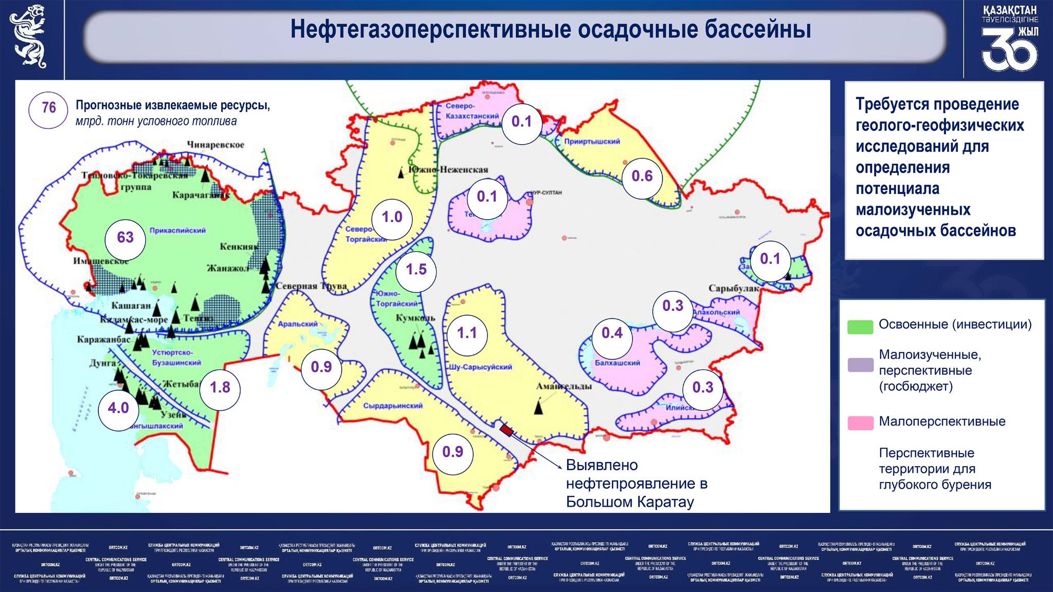 На сегодня весь объем нефте-газо-добычи производится на 5-ти освоенных бассейнах. Из них самым крупным считается Прикаспийский, на который приходится около 80% ресурсной базы страны. Для изучения 5 малоизученных бассейнов — Северо-Тургайский, Прииртышский, Аральский, Сырдарьинский, Шу-Сарысуйский, обладающих огромным потенциалом, — необходимо привлекать инвесторов и предоставить им государственную поддержку.