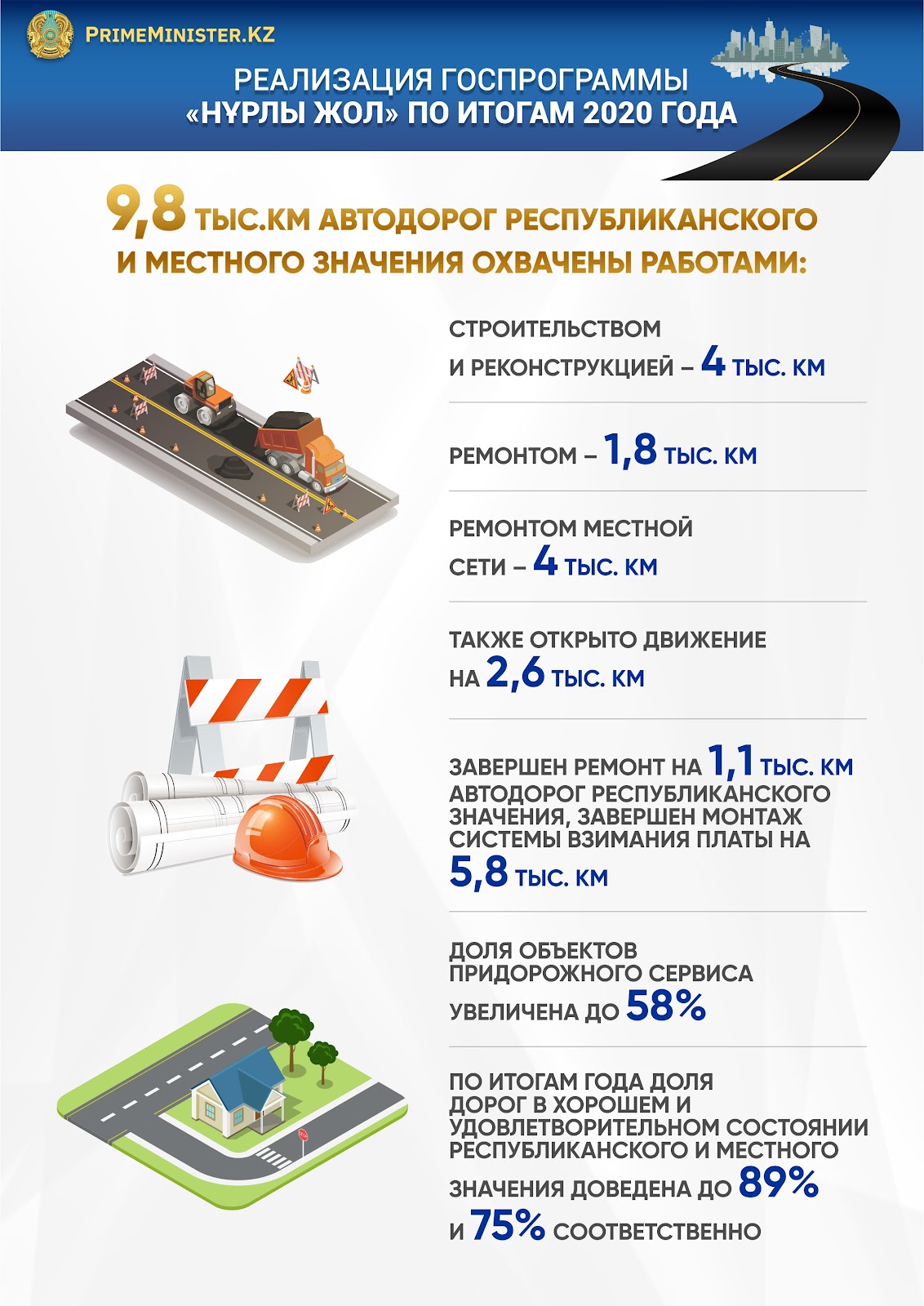 В 2020 году в рамках государственной программы инфраструктурного развития «Нұрлы жол» было охвачено строительством, реконструкцией и ремонтными работами 9,8 тыс.км автодорог республиканского и местного значения, в том числе: строительством и реконструкцией – 4 тыс.км, ремонтом – 1,8 тыс.км республиканской сети, а также ремонтом местной сети – 4 тыс.км.