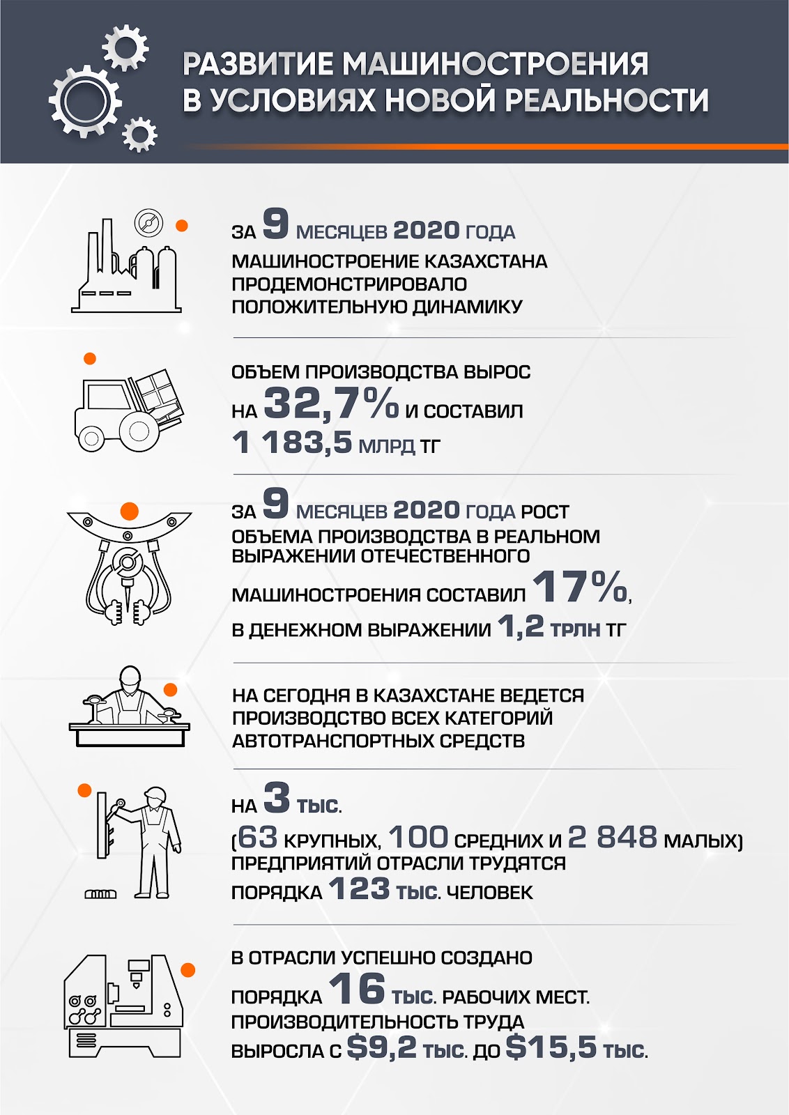 «Несмотря на кризис пандемии, отечественные машиностроители практически не останавливали производство. По итогам 9 месяцев 2020 года рост объема производства в реальном выражении отечественного машиностроения составил 17%, в денежном выражении 1,2 трлн тг. За последние 10 лет индустриализации в машиностроении объем производства вырос в четыре раза, инвестиции – в 2,5 раза, объем экспорта вырос в 3 раза», — отметил председатель правления «Союза машиностроителей Казахстана» Мейрам Пшембаев.