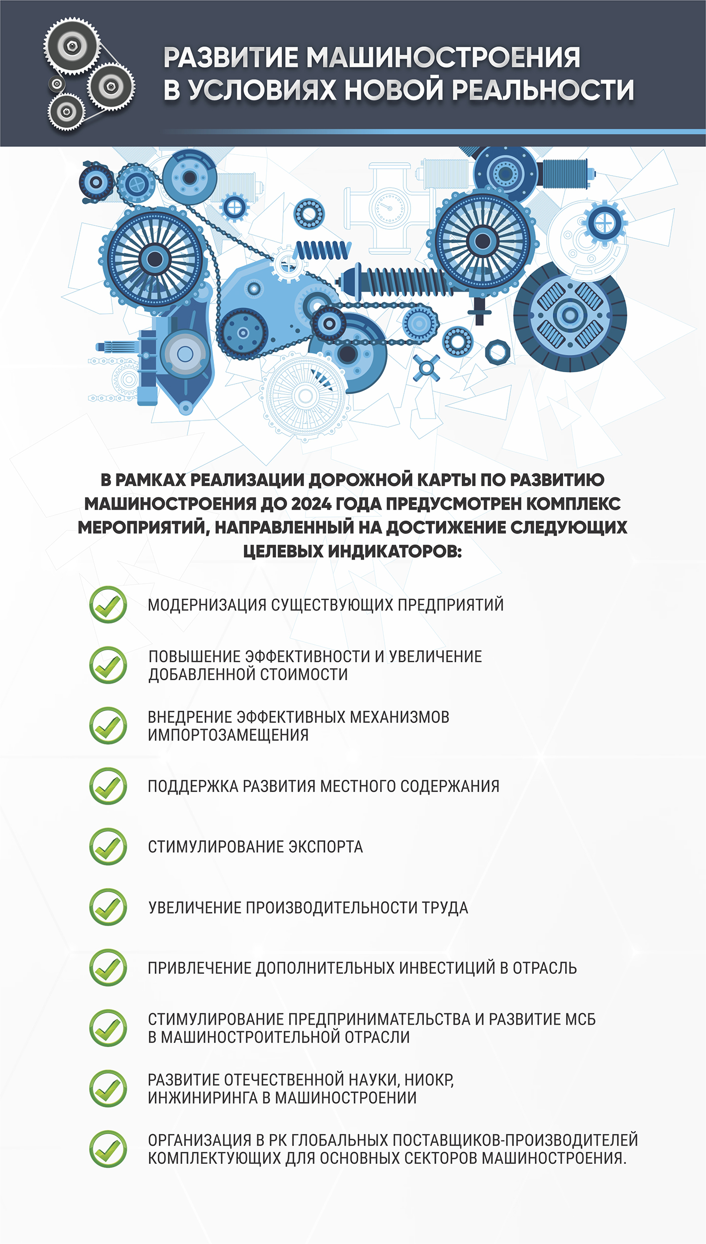 Дорожная карта предусматривает эффективное развитие машиностроительных предприятий. Такие меры, как введение налоговых преференций в обмен на встречные обязательства, разработка Закона «О промышленной политике» и создание Фонда развития промышленности придадут стимул для дальнейшего более интенсивного развития машиностроения.