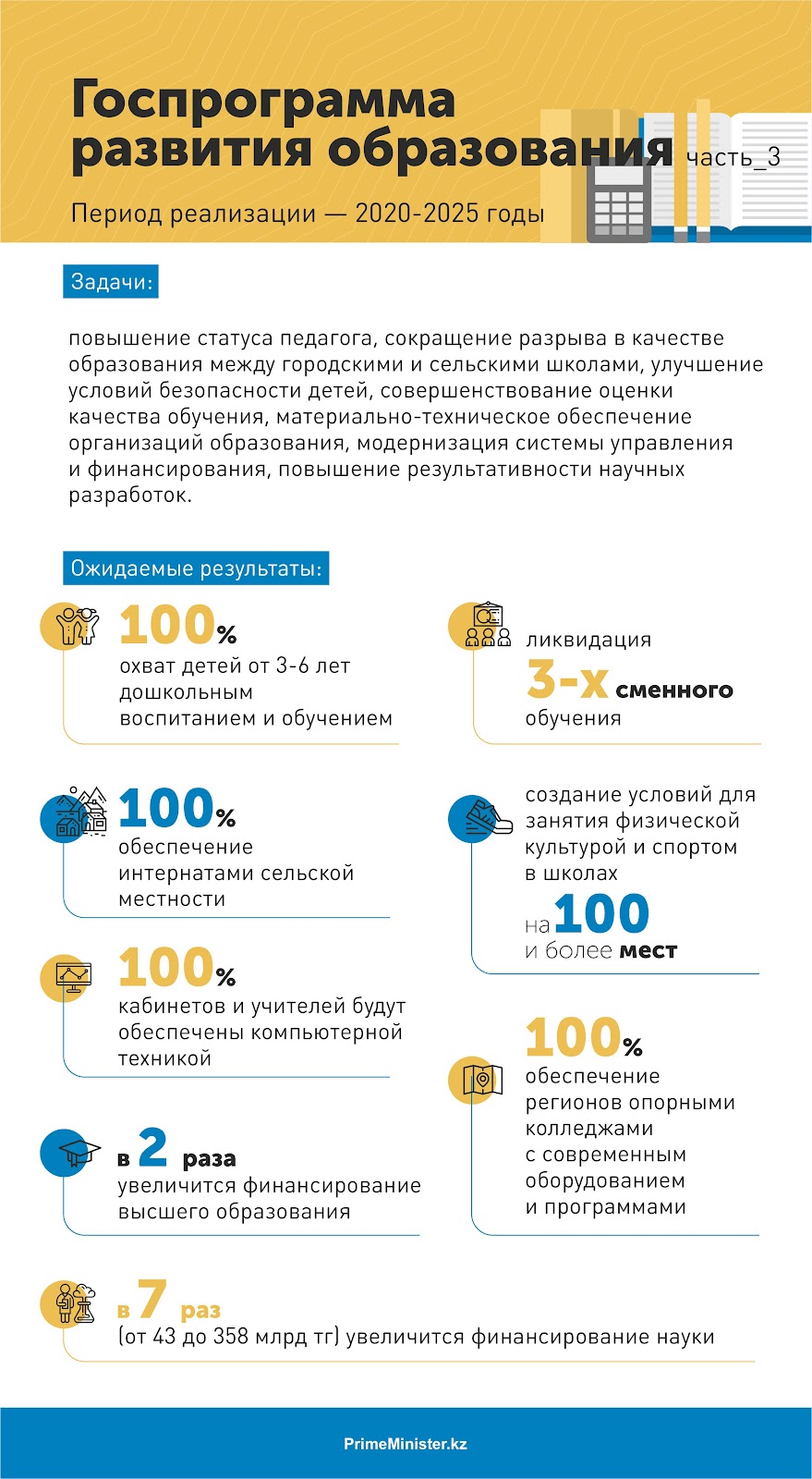 При этом будет обеспечен 100% охват детей детскими садами, полностью ликвидируется трехсменное обучение, число аварийных школ. До 2025 года в стране будет построено около 800 новых школ. В опорных населенных пунктах будут построены 114 интернатов.