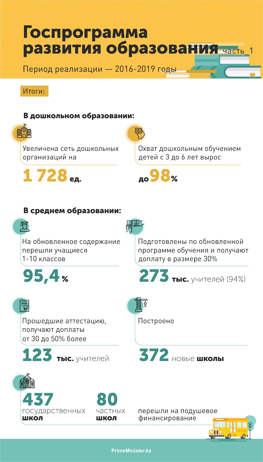 По итогам реализации госпрограммы на 2016-2019 годы увеличена сеть дошкольных организаций на 1728 ед., охват дошкольным обучением детей с 3 до 6 лет вырос до 98%. На обновленное содержание перешли учащиеся 1-10 классов (95,4%). 273 тыс. учителей (94%) подготовлены по обновленной программе обучения и получают доплату в размере 30%. Более 123 тыс. учителей, прошедших аттестацию, получают доплаты от 30 до 50%.