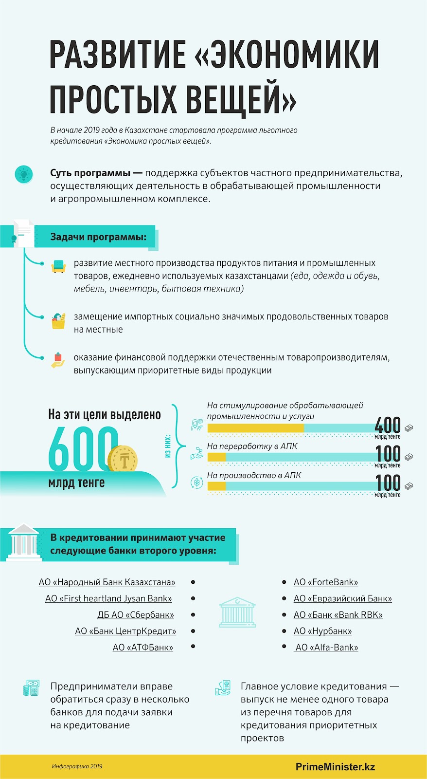 Для поддержки субъектов частного предпринимательства Национальным Банком Республики Казахстан за счет собственных средств и средств, находящихся в его управлении, было выделено 600 млрд тенге. Из них 400 млрд тенге — на стимулирование обрабатывающей промышленности и услуги, 100 млрд тенге — на переработку в АПК, еще 100 млрд тенге — на производство в АПК.