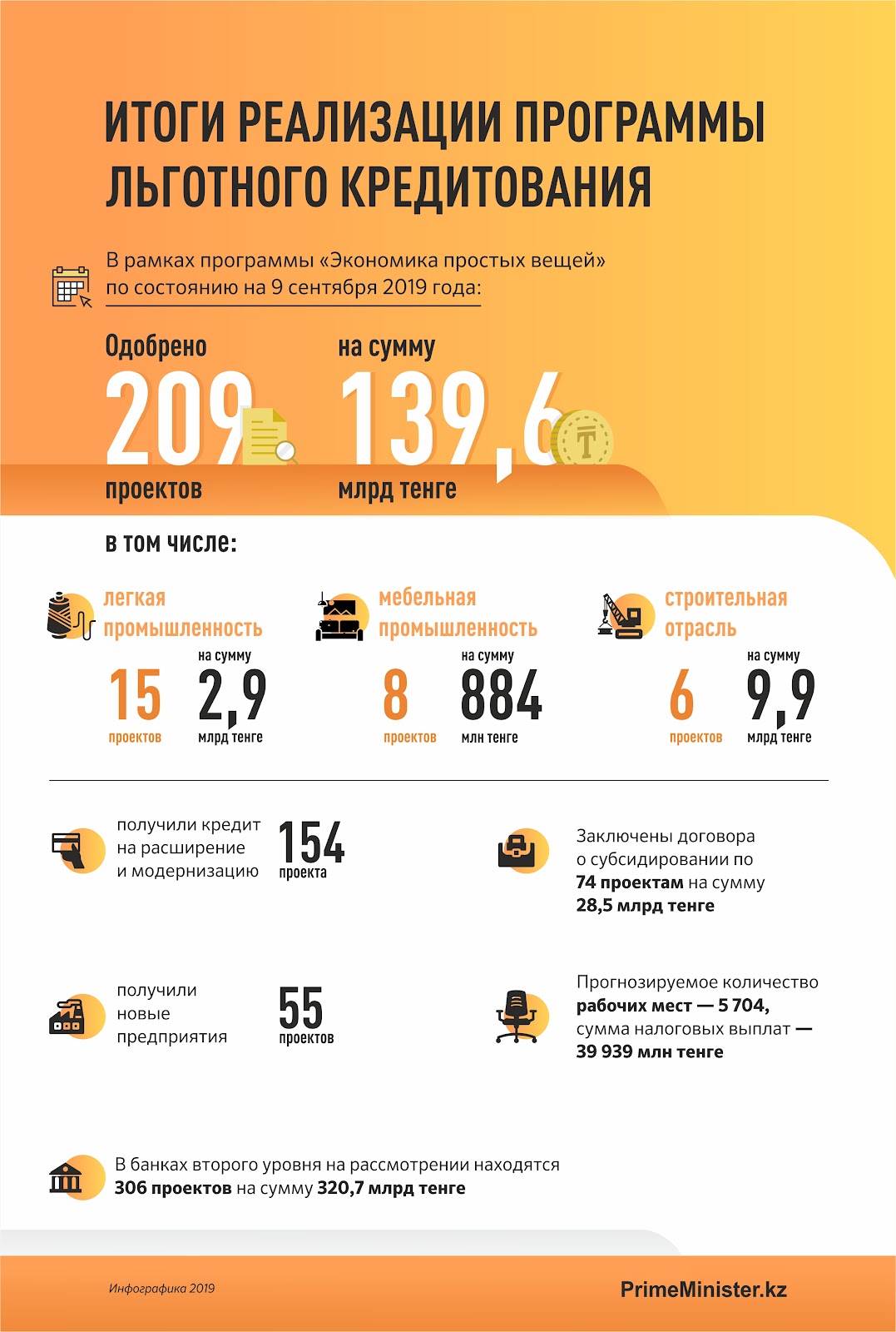 Из 209 одобренных проектов 154 получили кредит на расширение и модернизацию, 55 — новые предприятия. Прогнозируемое количество рабочих мест — 5704, сумма налоговых выплат — 39 939 млн тенге.