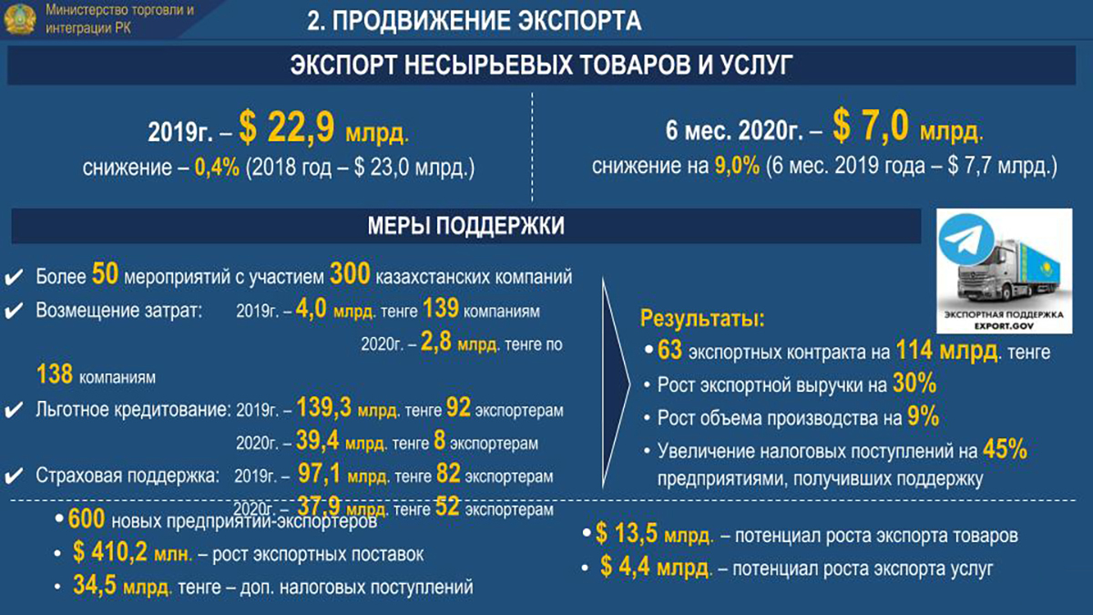 В текущих сложных условиях Казахстан проводит проактивную политику поддержки несырьевых экспортеров. В прошлом году более 300 казахстанских компаний при содействии Министерства приняли участие в 50 зарубежных выставках и заключили 63 экспортных контракта на 114 млрд тг.