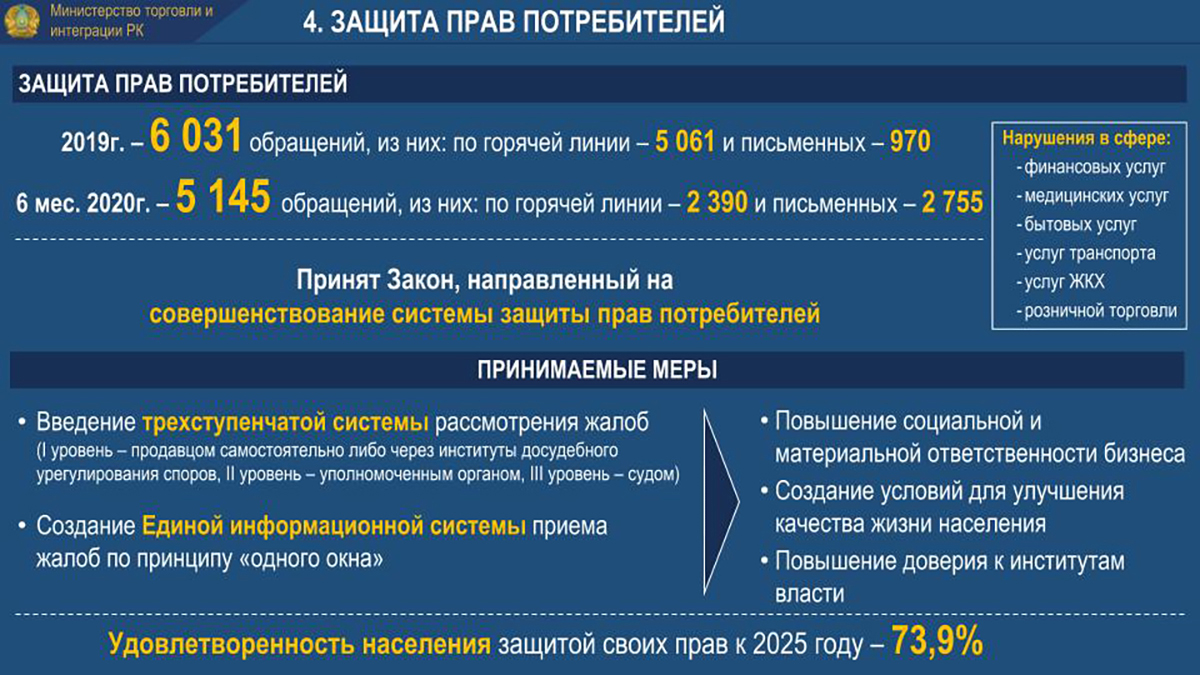 «В Казахстане 18 миллионов потребителей. Это 18 миллионов требовательных контролеров качества товаров и услуг. Изменение в законодательство позволило нам не только расширить инструменты для общественного контроля, но дать старт созданию полноценной национальной системы защиты прав потребителей. Мы ввели трехступенчатую систему рассмотрения жалоб и работаем над созданием Единой информационной системы приема жалоб по принципу «одного окна», — сказал министр.