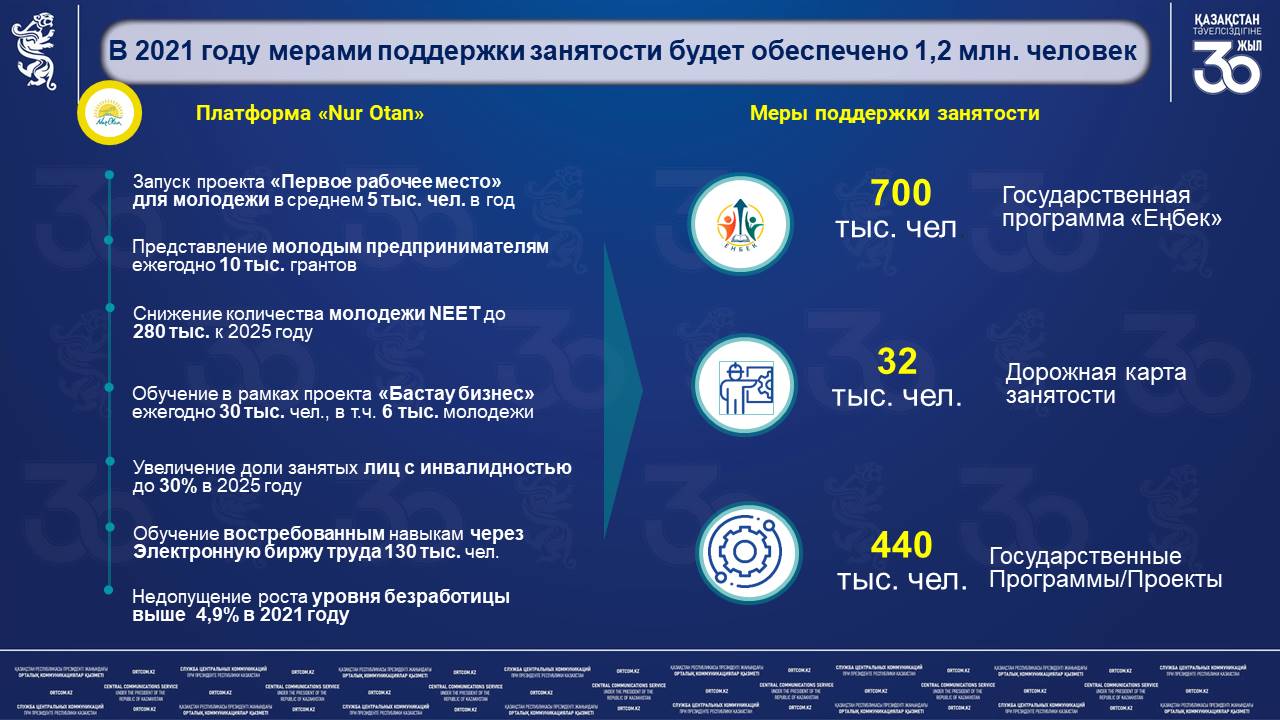 В 2021 году мерами содействия занятости планируется охватить почти 1,2 млн человек, в том числе в рамках Госпрограммы «Еңбек» — 700 тыс., по антикризисной Дорожной карте занятости — 32 тыс., в рамках других госпрограмм — 440 тыс. человек.
