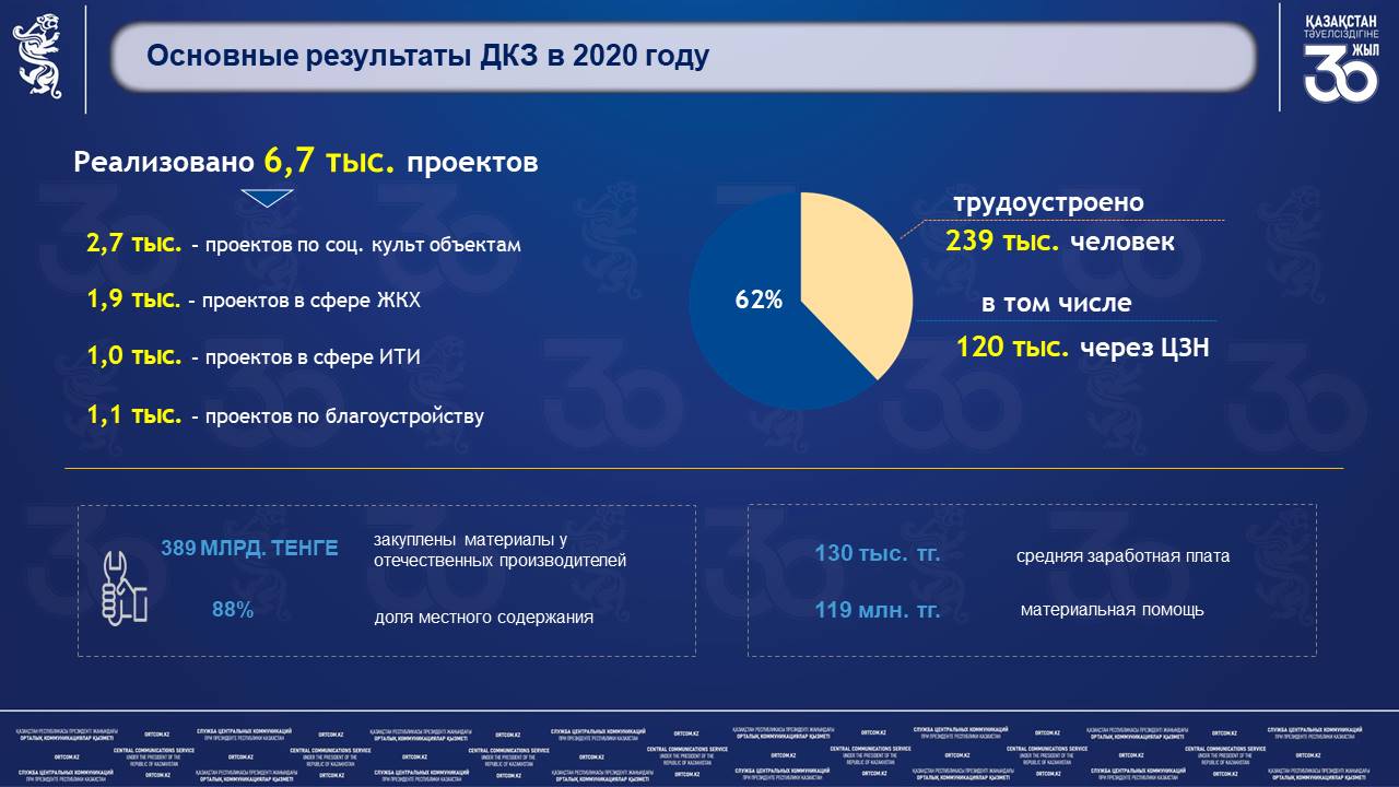 «В целях снижения негативных последствий пандемии COVID-19 по поручению Главы государства была разработана специальная социальная антикризисная программа «Дорожная карта занятости». В рамках ее реализации проведены работы по строительству и ремонту 6,7 тыс. объектов. Трудоустроены 239 тыс. человек, более половины из них являются лицами, ищущими работу, и безработными, зарегистрированными в центрах занятости населения. У отечественных производителей закуплены материалы на 389 млрд тг», — сказал Ержан Биржанов.