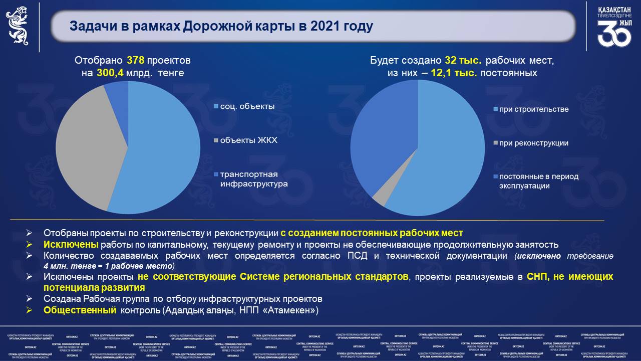 По поручению Главы государства также продолжается реализация ДКЗ, с акцентом на создание постоянных рабочих мест. На сегодня местными исполнительными органами отобрано 378 инфраструктурных проектов, с созданием 32 тыс. рабочих мест, в том числе 12,1 тыс. постоянных. Дорожная карта занятости дополнена новым направлением по льготному микрокредитованию со ставкой не более 6%. Получателями микрокредитов в рамках ДКЗ планируется создание 11 тыс. дополнительных рабочих мест.