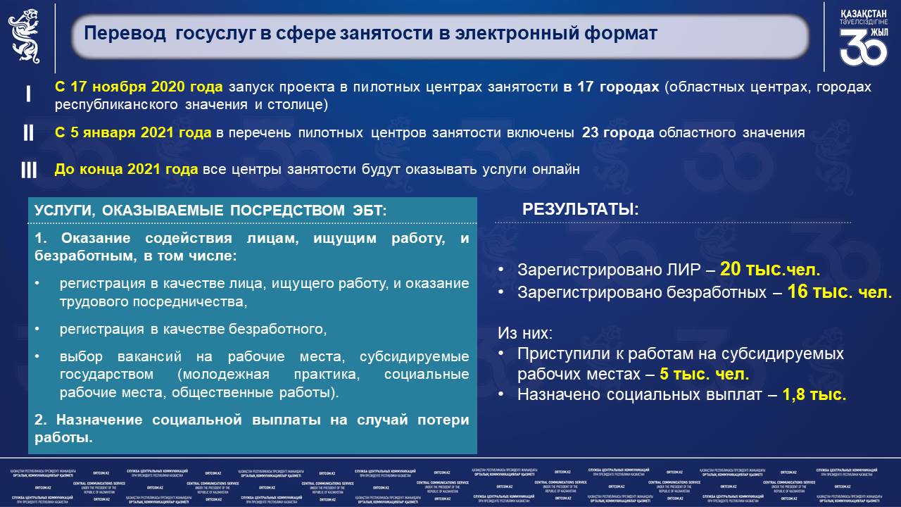С 5 января 2021 года в перечень пилотных центров занятости дополнительно включены 23 города областного значения. В рамках пилота 20 тыс. человек зарегистрированы в качестве лица, ищущего работу, 16 тыс. человек в качестве безработных.