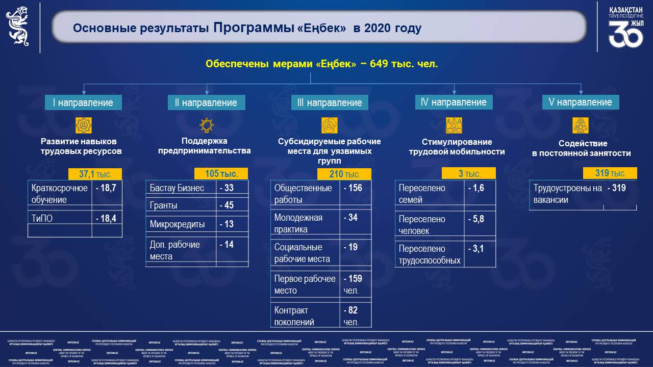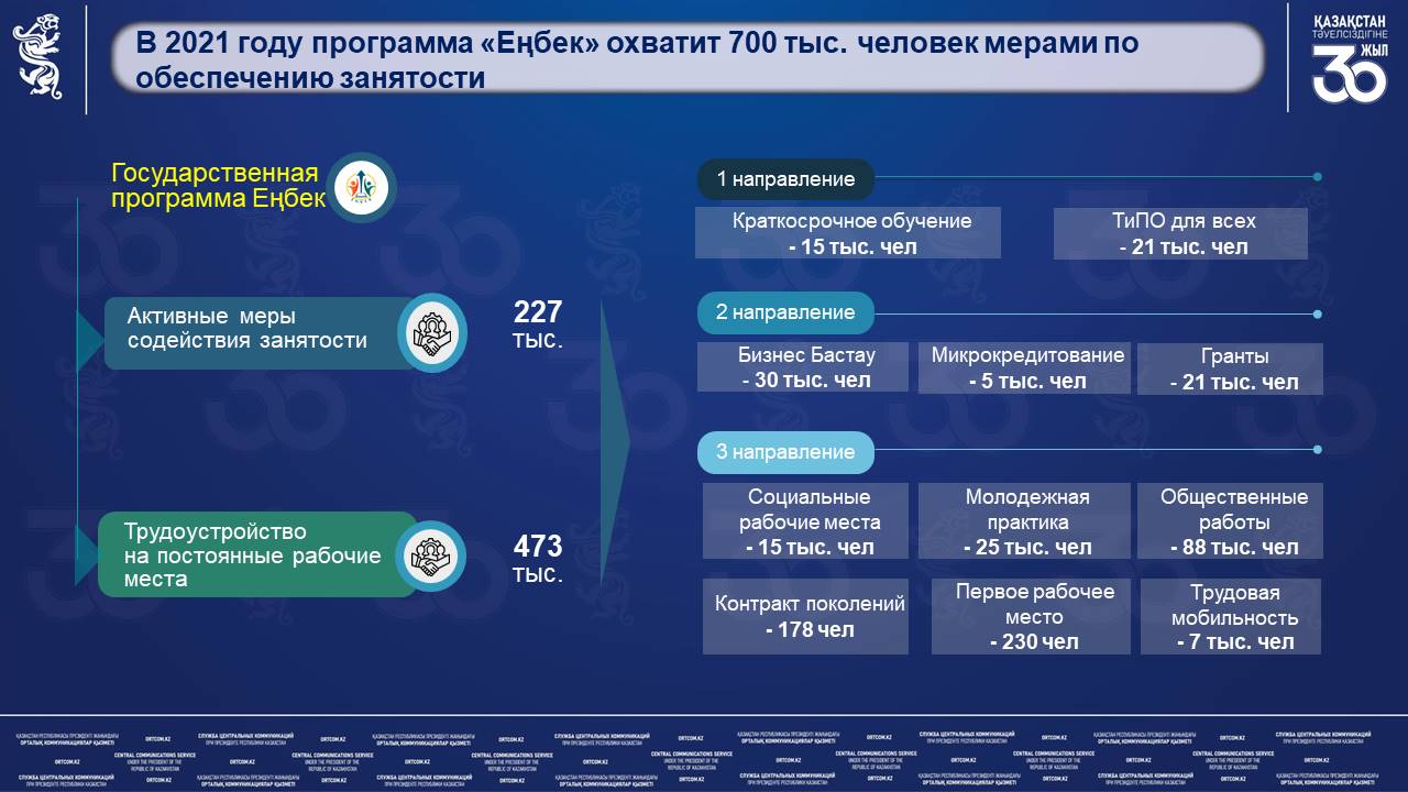 «Из 700 тыс. человек по Госпрограмме «Еңбек», 473 тыс. будут трудоустроены на рабочие места, а 227 тыс. будут оказываться различные меры содействия занятости, которые включают в себя 3 направления. По первому направлению на краткосрочные курсы обучения и обучение в организации ТиПО будет направлено 36 тыс. человек. По второму направлению, предусматривающему поддержку предпринимательства, 30 тыс. человек мы планируем охватить обучением бизнес-навыкам, 5 тыс. человек получат микрокредиты, и еще 21 тыс. будут выданы гранты на бизнес проекты. В рамках третьего направления за счет субсидируемых рабочих мест поддержка будет оказана 128 тыс. человек из числа людей, которым сложнее всего адаптироваться на рынке труда и 7 тыс. человек будут оказаны меры по поддержке их добровольного переезда из трудоизбыточных в трудодефицитные регионы», — проинформировал вице-министр.