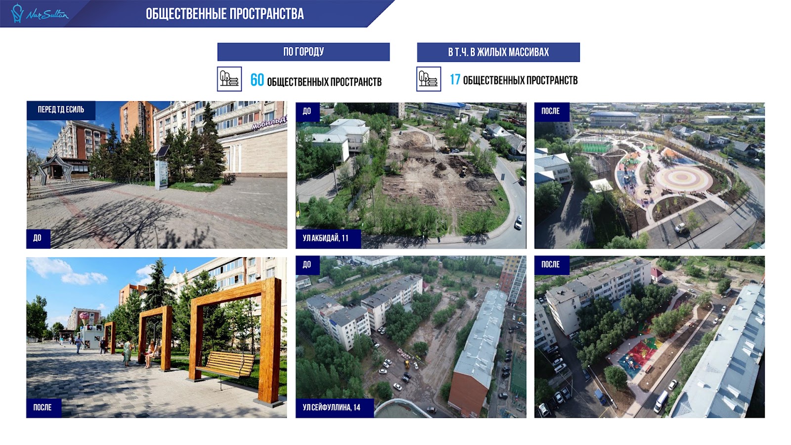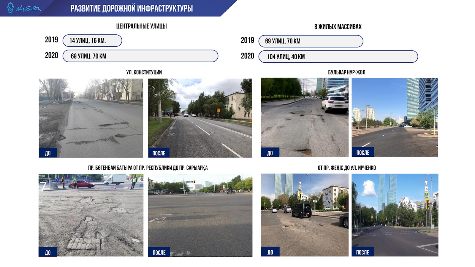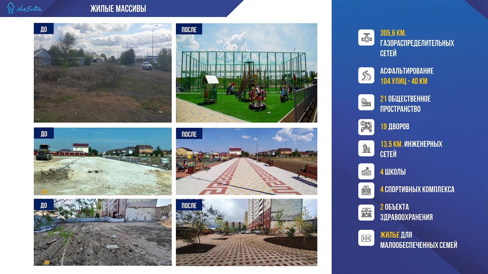 В жилых массивах Нур-Султана в 2020 году заасфальтировано более 100 улиц, благоустроено более 40 общественных пространств (парки, скверы, бульвары) и дворов, построены ряд социальных объектов, в том числе школы, проводится работа по газификации и т.д.