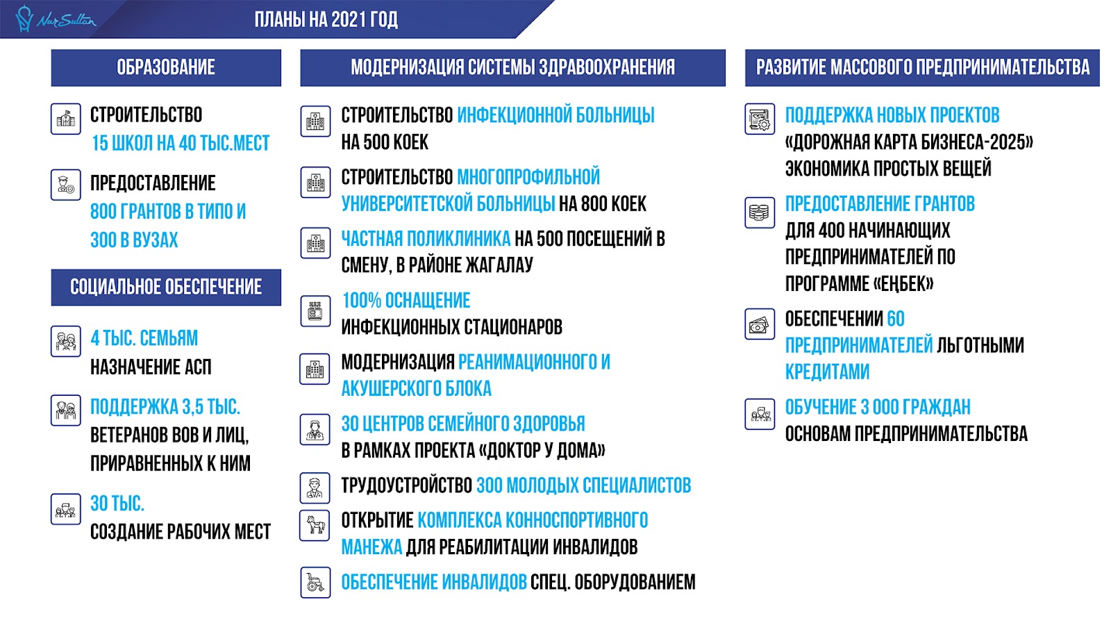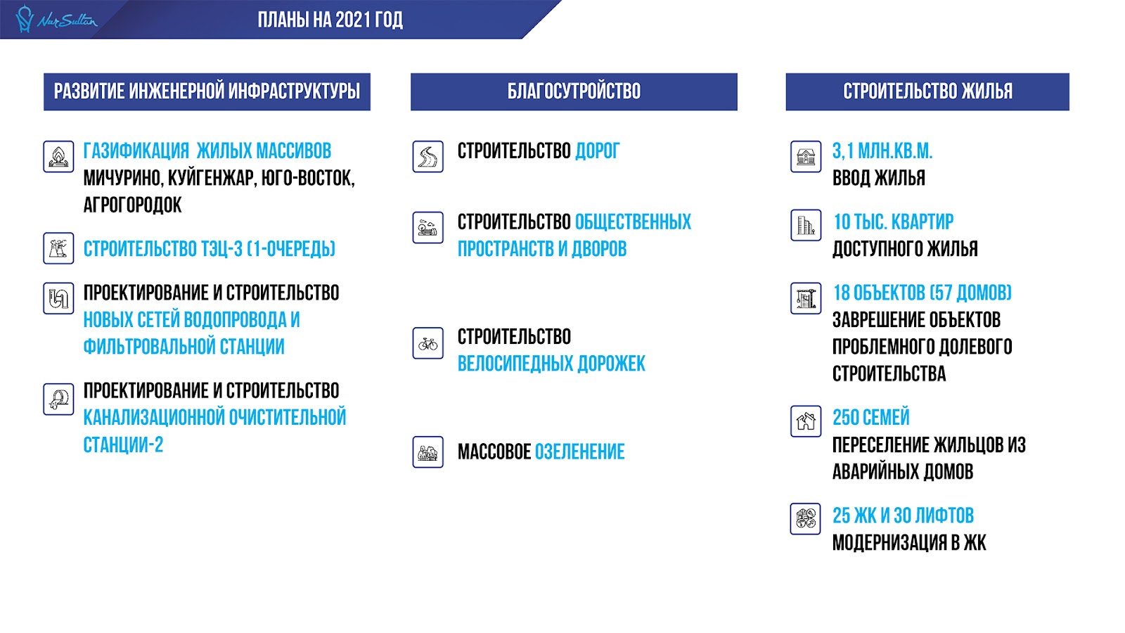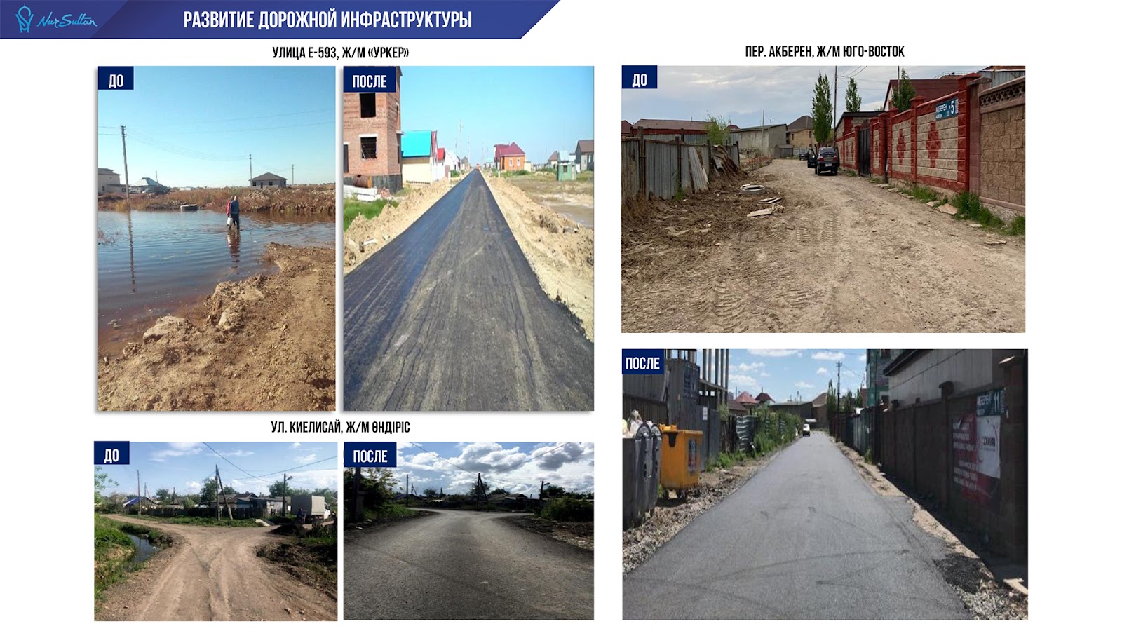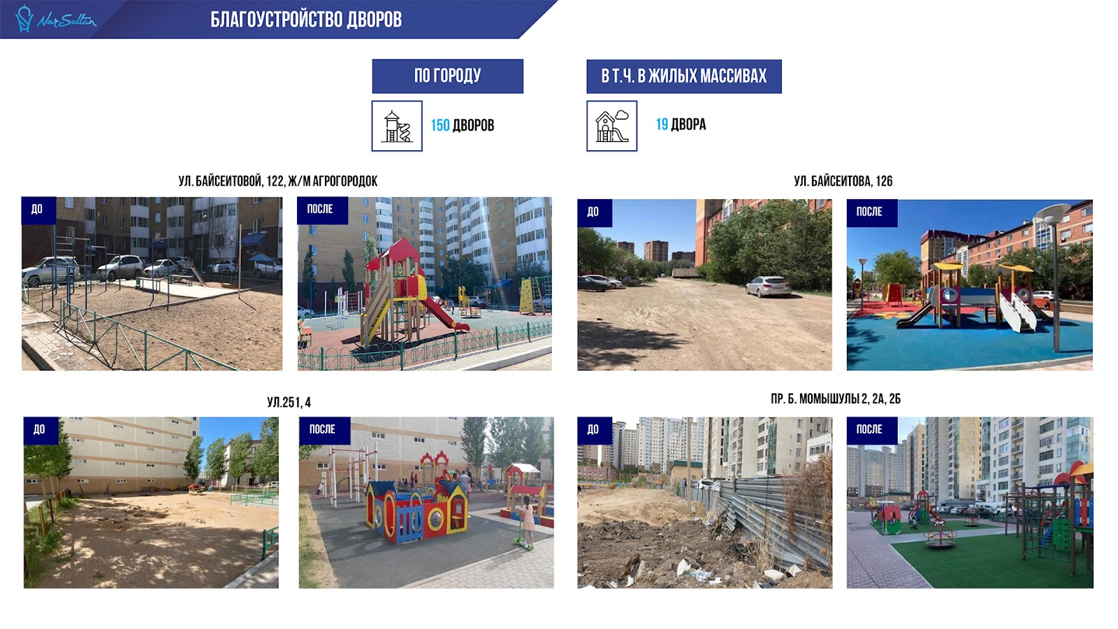 В жилых массивах Нур-Султана в 2020 году заасфальтировано более 100 улиц, благоустроено более 40 общественных пространств (парки, скверы, бульвары) и дворов, построены ряд социальных объектов, в том числе школы, проводится работа по газификации и т.д.