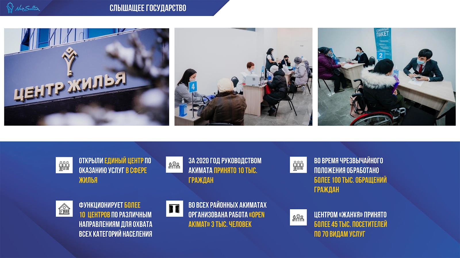 Кроме того, в 2020 году акиматом столицы на приемах граждан было принято 10 тыс. граждан. Жители столицы также получают ответы на вопросы в Центре поддержки института семьи “Жануя”, в Едином центре по оказанию услуг в сфере жилья, в центре iQala, через “iKomek 109” и официальные аккаунты акимата в соцсетях.