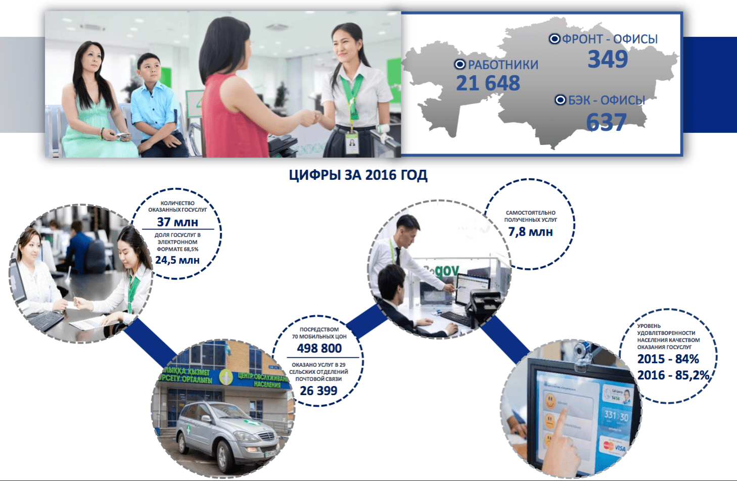 Для обслуживания жителей отдаленных населенных пунктов действует 70 мобильных ЦОНов, совершающих более 13 тыс. выездов в год. Совместно с «Казпочтой» реализуется проект по предоставлению госуслуг в офисах национального почтового оператора, сеть которого охватывает большую часть населенных пунктов РК.