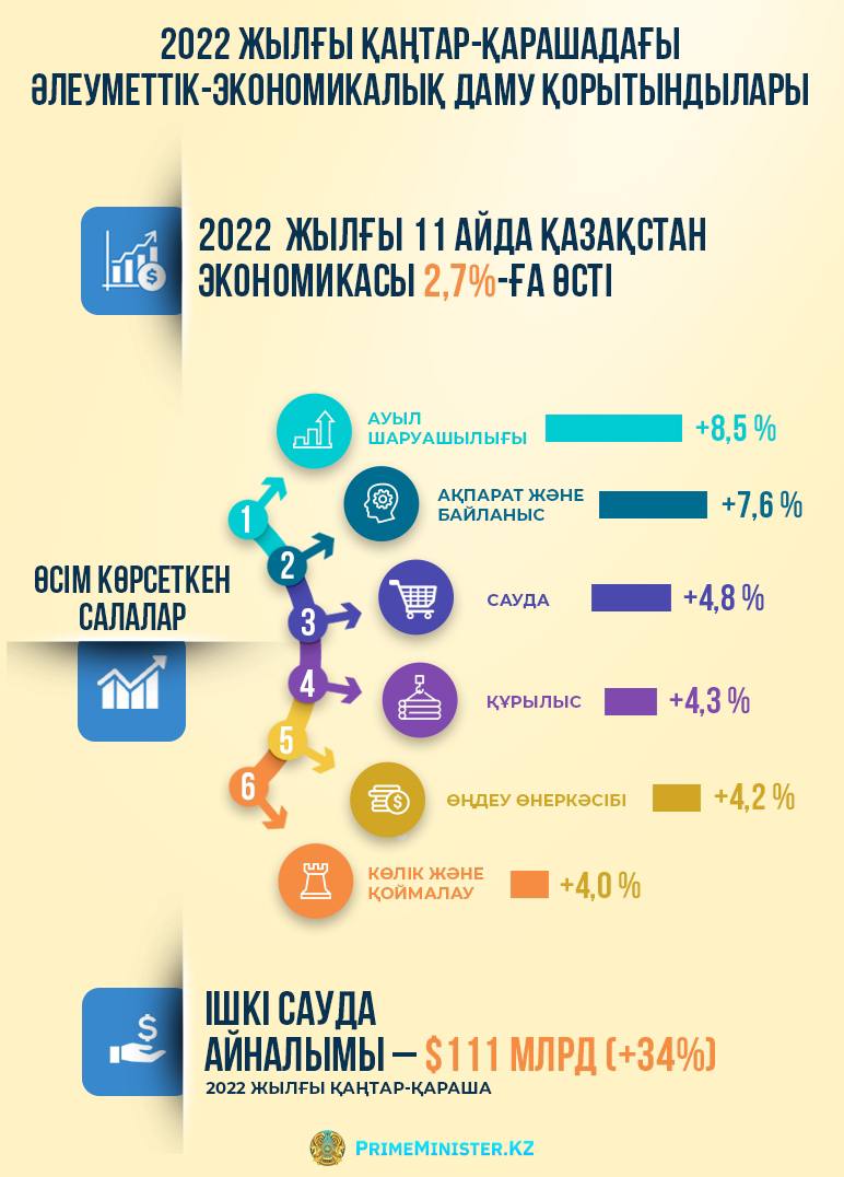 Әлихан Смайыловтың хабарлауынша, қаңтар-қарашада экономиканың өсу қарқыны 2,7% деңгейінде болды. Ауыл шаруашылығы, ақпарат және байланыс, құрылыс, өңдеу өнеркәсібі, сауда, көлік және қоймалау салалары оң өсуді көрсетуде. Экономика өсуінің баяулауы мұнай және тау-кен өндірістеріндегі баяулаумен байланысты.