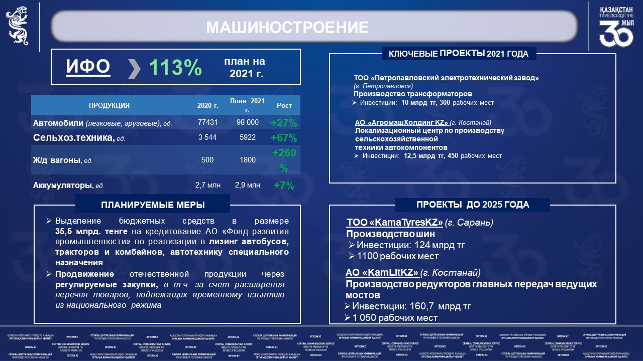 Планируется увеличение объема производства транспортных средств на 34%, аккумуляторов на 11%, ж/д вагонов на 127%, сельхозтехники на 58%.
