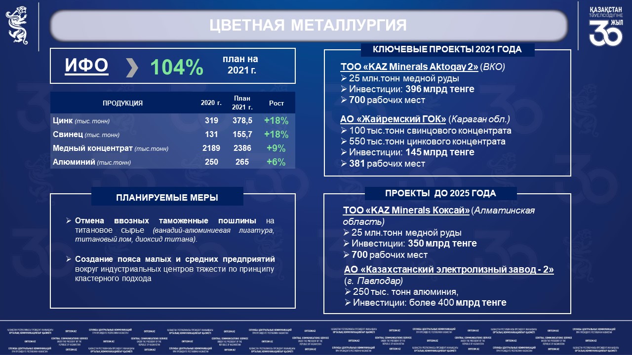 «В цветной металлургии рост составил 3% (1,5 трлн тг). Здесь благоприятную роль сыграла конъюнктура внешнего рынка, у наших предприятий увеличились объемы сбыта (свинец, медь) в традиционных рынках за счет снижения поставок с других стран», — отметил Б. Атамкулов.