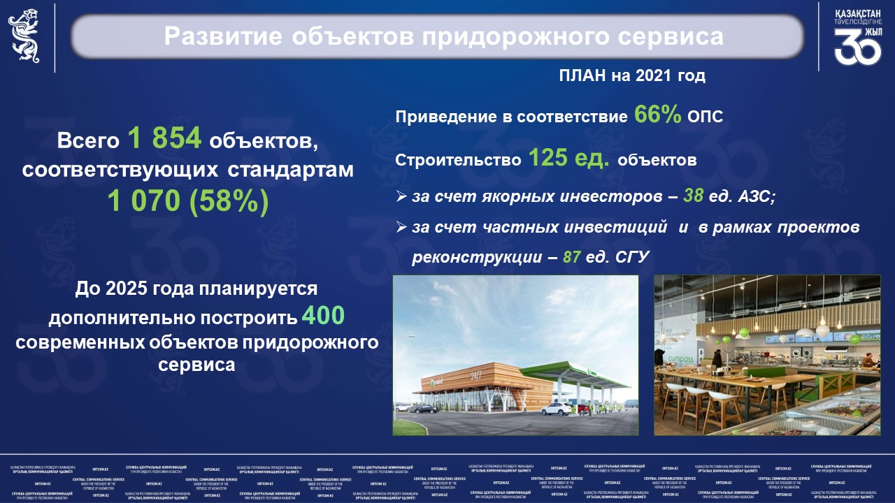 - доведение 100% дорог республиканского значения и 95% местного значения до нормативного состояния;