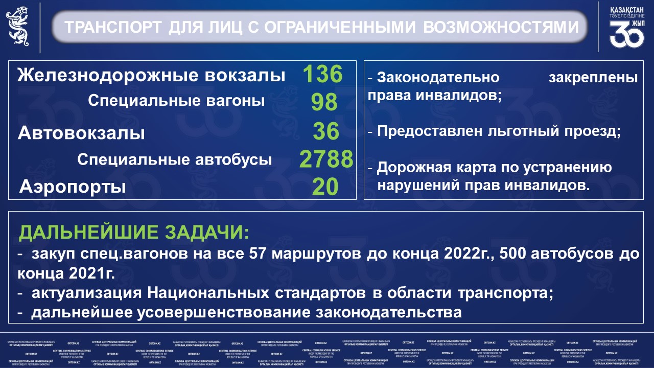 На сегодняшний день в стране 136 железнодорожных вокзалов, 36 автовокзалов и 20 аэропортов соответствуют требованиям по беспрепятственному доступу маломобильных лиц, где задействованы 98 специальных вагонов и 2 788 специальных автобусов.