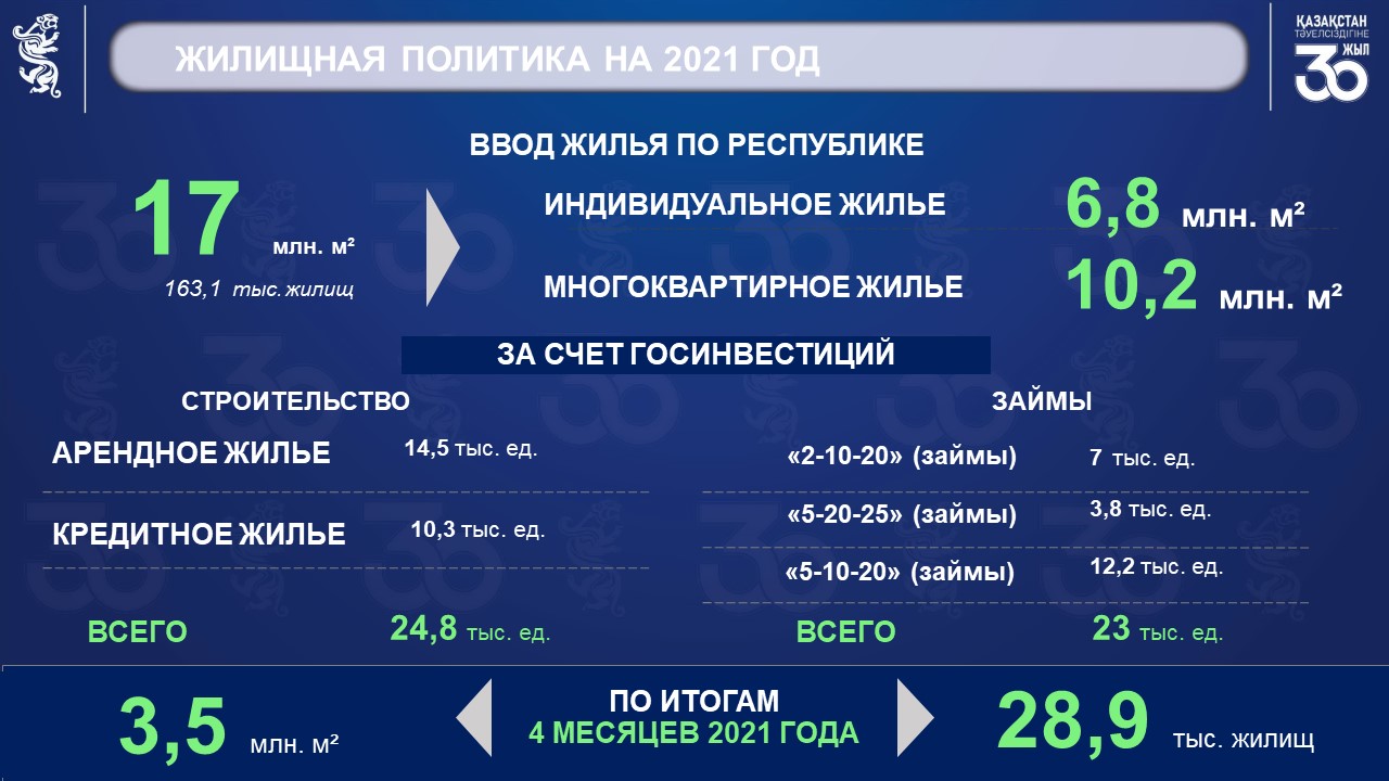 Для решения всех этих вопросов в соответствии с Предвыборной программой партии «Nur Otan» до 2025 года планируется строительство 103 млн кв. м жилья или 977 тыс. жилищ.