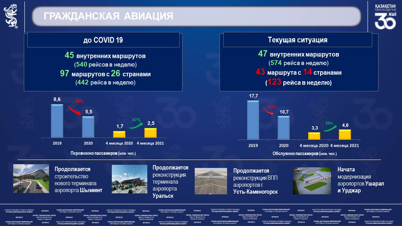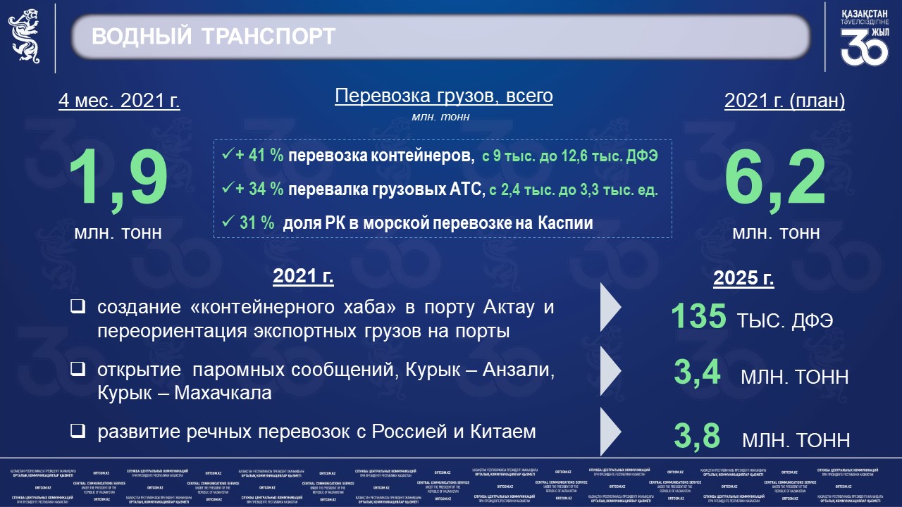 «Хочу отметить, что в целом отрасль динамично развивается. Конечно же, пандемия внесла большие коррективы в транспортную отрасль в целом. Пострадали как пассажирские, так и грузовые перевозки всеми видами транспорта. Так, за январь-апрель 2021 года индекс физического объема валовой добавленной стоимости транспортной отрасли составил 91% от предыдущего года», — сообщил Б. Атамкулов.
