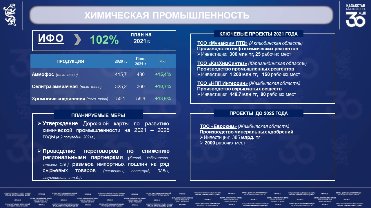 «Мы планируем увеличить объемы производства фосфорных удобрений на 16%, аммофоса на 15%, селитры аммиачной на 10%, хромовых соединений на 13%», — проинформировал Б. Атамкулов.