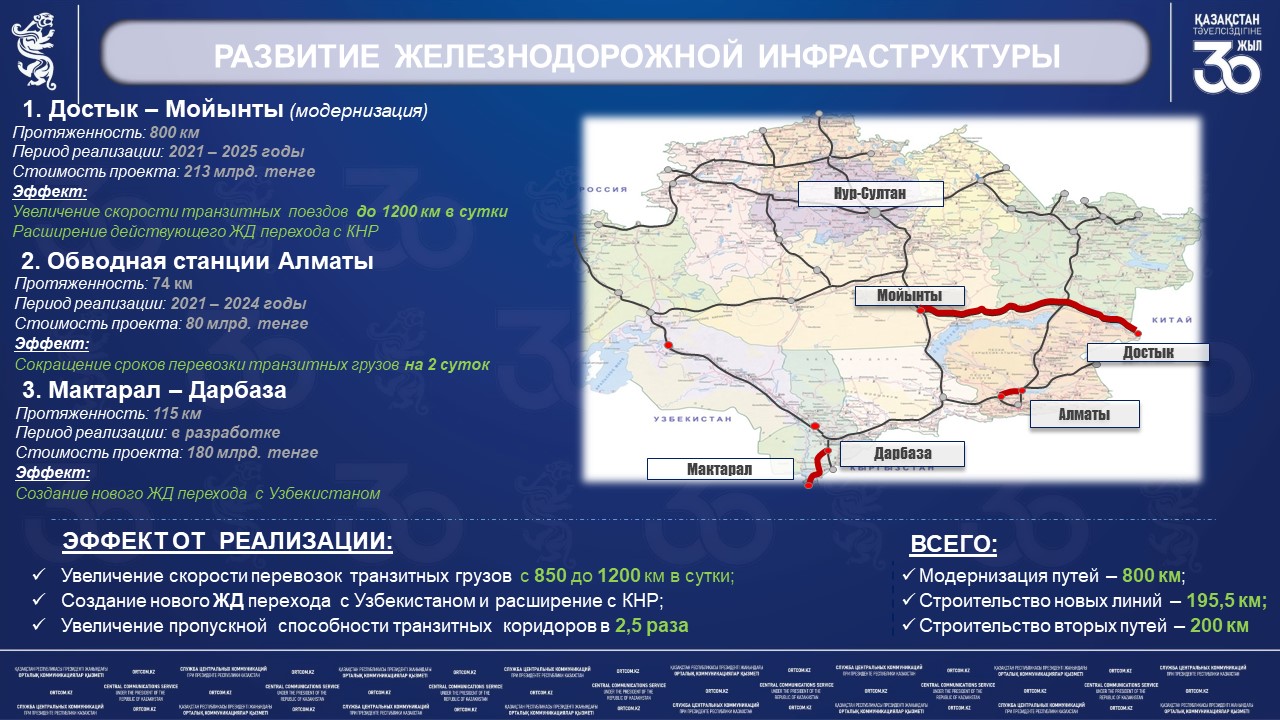 Кроме того, в перспективе планируется реализация проектов «Строительство обводной станции Алматы» и железнодорожная линия «Дарбаза – Мактаарал».
