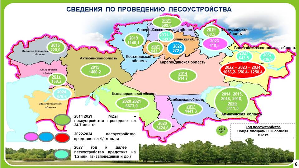 С 2014 года по 2021 год проведено лесоустройство гос. лес фонда, на площади 24,7 млн га (82,3%). В 2022-2024 годах эта работа будет продолжена. Основной задачей лесоустройства является переход на непрерывное лесоустройство к 2027 году. Таким образом периодичность лесоустроительных работ (каждые 10 лет лесные учреждения, 15 лет природные парки и резерваты, 25 лет заповедники) восстановится, проблема просрочки лесоустроительных проектов будет решена.
