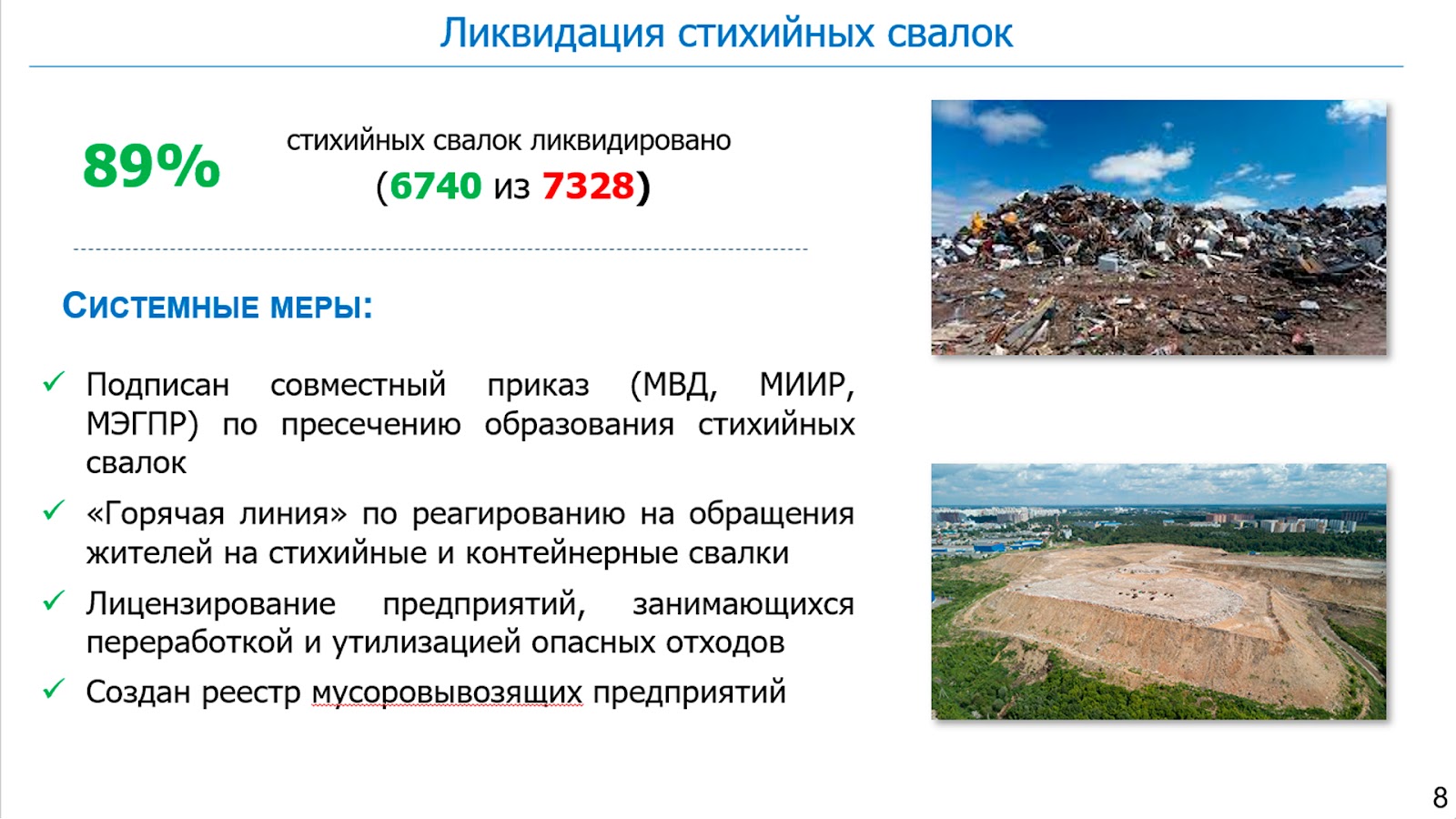 1) подписан совместный приказ (МВД, МИИР, МЭГПР) по пресечению образования стихийных свалок;