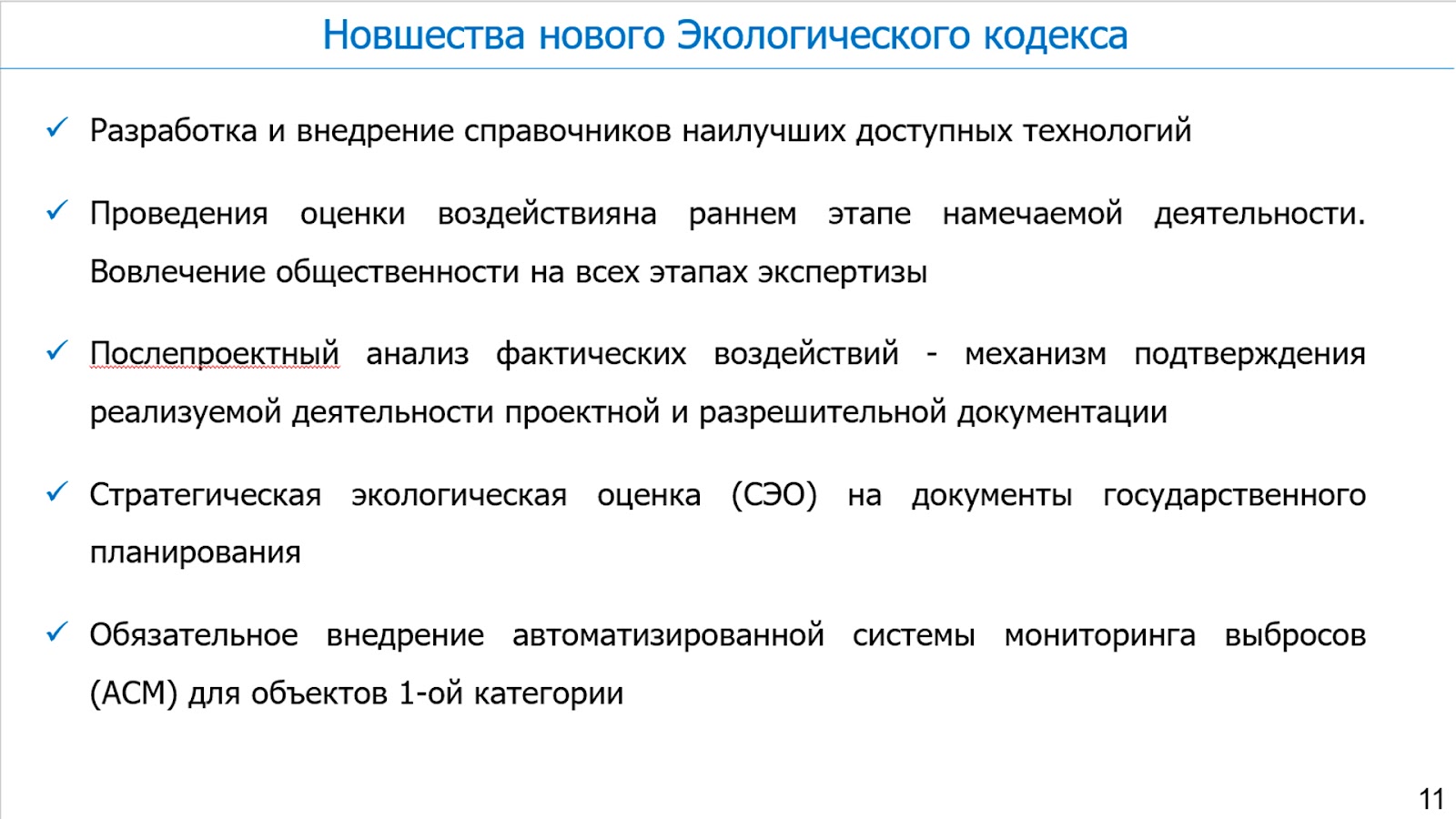 1) Разработка и внедрение справочников наилучших доступных технологий. Ожидаемый результат — снижение эмиссий в окружающую среду за счет модернизации технологических процессов. На первом этапе запланирован переход 50 крупных компаний выбросы которых составляют 80% страны.