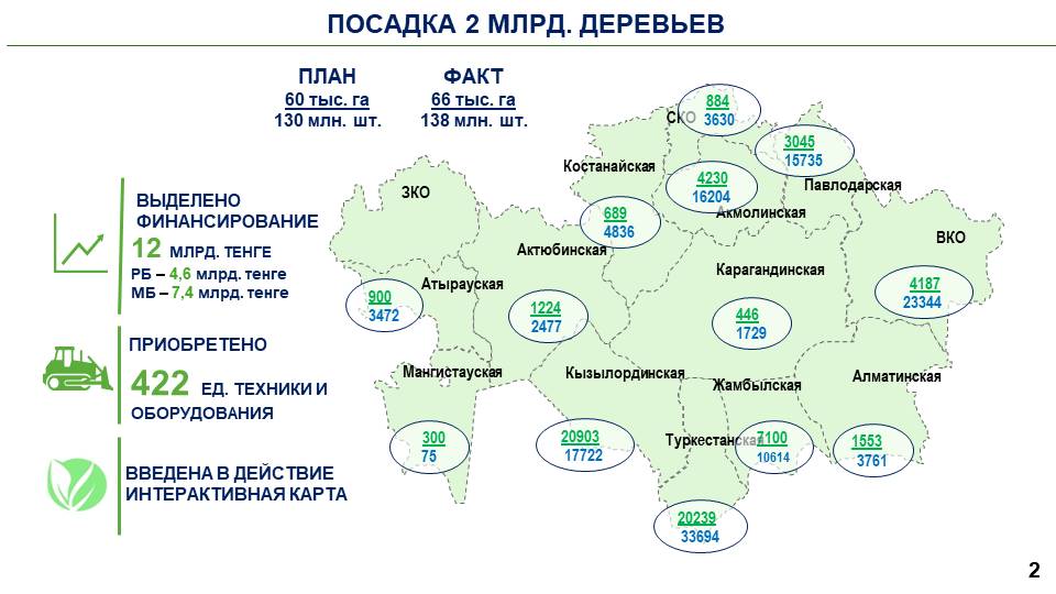 Справочно: имеется 100% обеспеченность площадями для лесоразведения. Для посадки наряду с выращиванием посадочных материалов, планируется приобретение 40 млн посадочного материала у частных питомников. В текущем году в целях стимулирования бизнеса на развитие и создание частных питомников и плантаций быстрорастущих древесных кустарниковых пород на возмещения расходов до 50% предусмотрены финансовые средства в размере более 707 млн тенге. В базу геоданных внесены сведения из утвержденных Комплексных планов по воспроизводству лесов и лесоразведению по областям РК. Интерактивная карта позволяет отображать в картографическом виде все планируемые показатели по областям, а также следить за качественным исполнением утвержденных планов.
