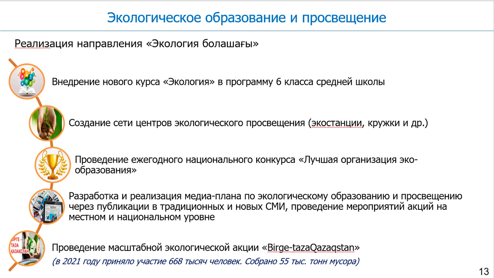 2. Запланировано создание сети центров экологического просвещения (экостанции, кружки и др.) и проведение ежегодного национального конкурса «Лучшая организация эко-образования»;