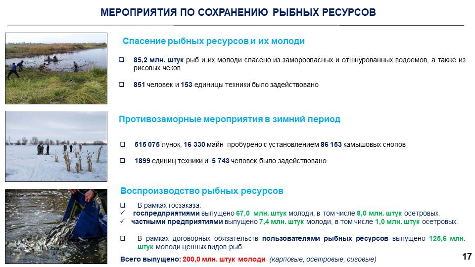 Следует отметить, что наряду с охранными мероприятиями, ежегодно принимаются меры по сохранению и воспроизводству рыбных ресурсов естественных водоемов. Это спасение рыб в весенний и осенний периоды, противозаморные мероприятия в зимний период, а также искусственное воспроизводство ценных видов рыб.