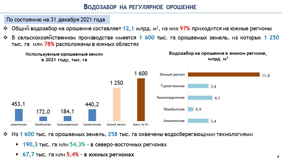 Из всего водозабора на регулярное орошение приходится порядка 12,1 км3. Из которых 11,8 км3 – на 4 южные области: Алматинская, Жамбылская, Туркестанская и Кызылординская с площадью орошения 1,25 млн га, т.е. это 97% от всего водозабора на орошение и 78% от всей орошаемой площади по стране.