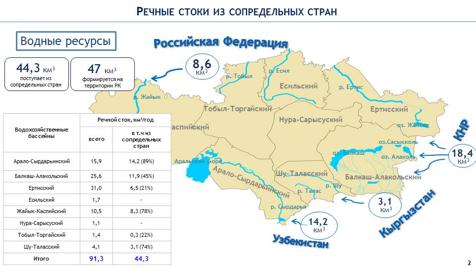 «По бассейну р. Сырдарья, совместно с Узбекистаном осуществляем товарообмен электроэнергией с Кыргызской Республикой и Республикой Таджикистан, что обеспечивает дополнительный сброс воды из водохранилищ Токтогул и «Бахри-Точик». Так, в прошлом году за счет таких мер из верхних водохранилищ было дополнительно сброшено порядка 700 млн м3 воды для нужд казахстанской стороны. С Кыргызстаном по бассейнам р. Шу и Талас в рамках Комиссии по использованию водохозяйственных сооружений межгосударственного пользования утверждаем режимы работ Орта-Токойского и Кировского водохранилищ, а также графики подачи воды по каналам межгосударственного пользования», — сообщил С. Кожаниязов.