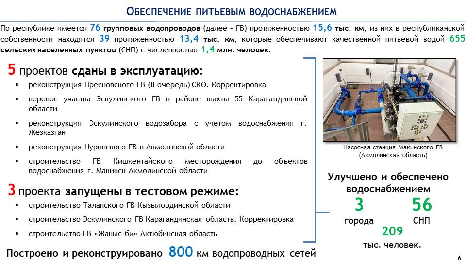 Также ведется работа по 5 проектам строительства и реконструкции групповых водопроводов протяженностью 194 км в Карагандинской, Кызылординской и Северо-Казахстанской областях что позволит улучшить водообеспечение в 94-х СНП с количеством населения более 300 тыс.человек.