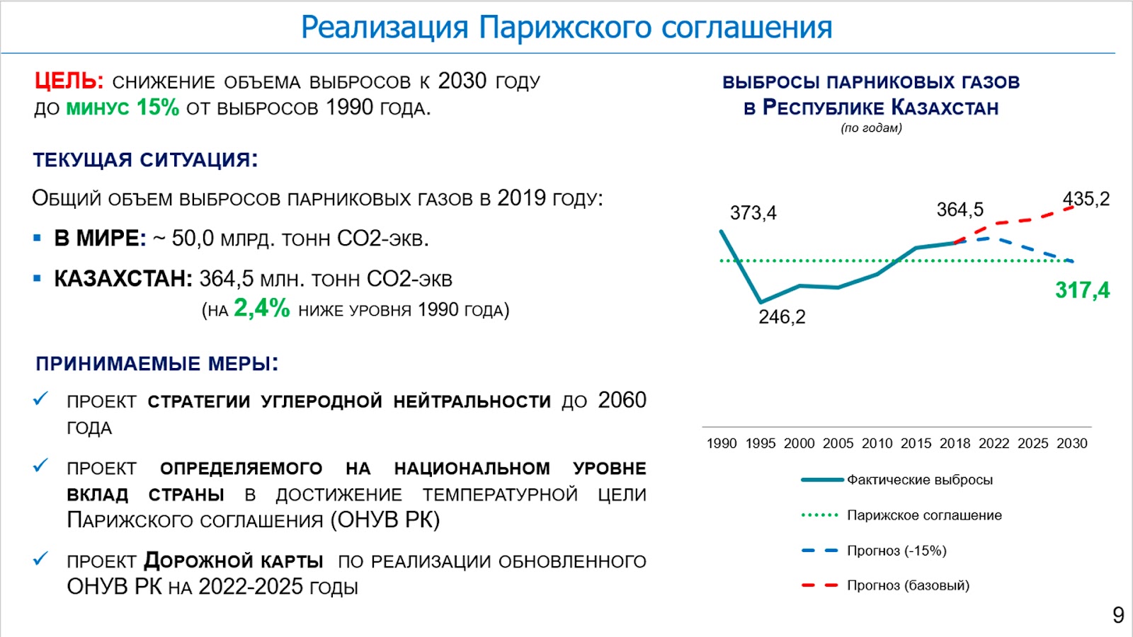 Казахстан принял обязательство по Парижскому соглашению сократить выбросы парниковых газов к 2030 году на 15%, т.е. на 56 млн тонн. В 2019 году добились снижения выбросов парниковых газов на 2,4% от уровня 1990 года. Министерством разработана дорожная карта по сокращению выбросов парниковых газов для всех основных объектов.