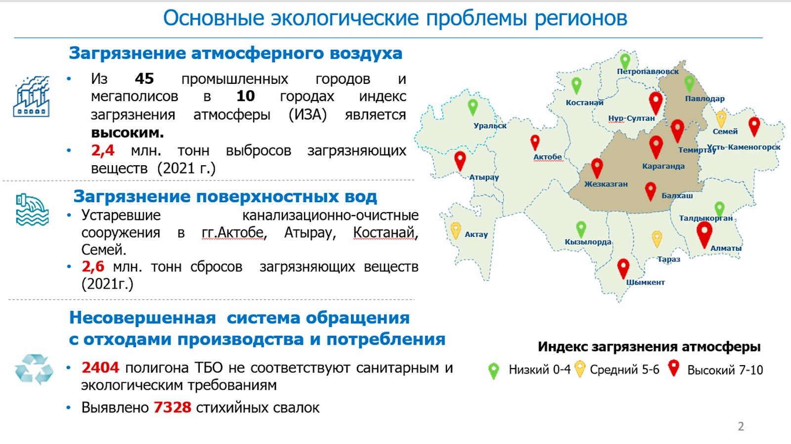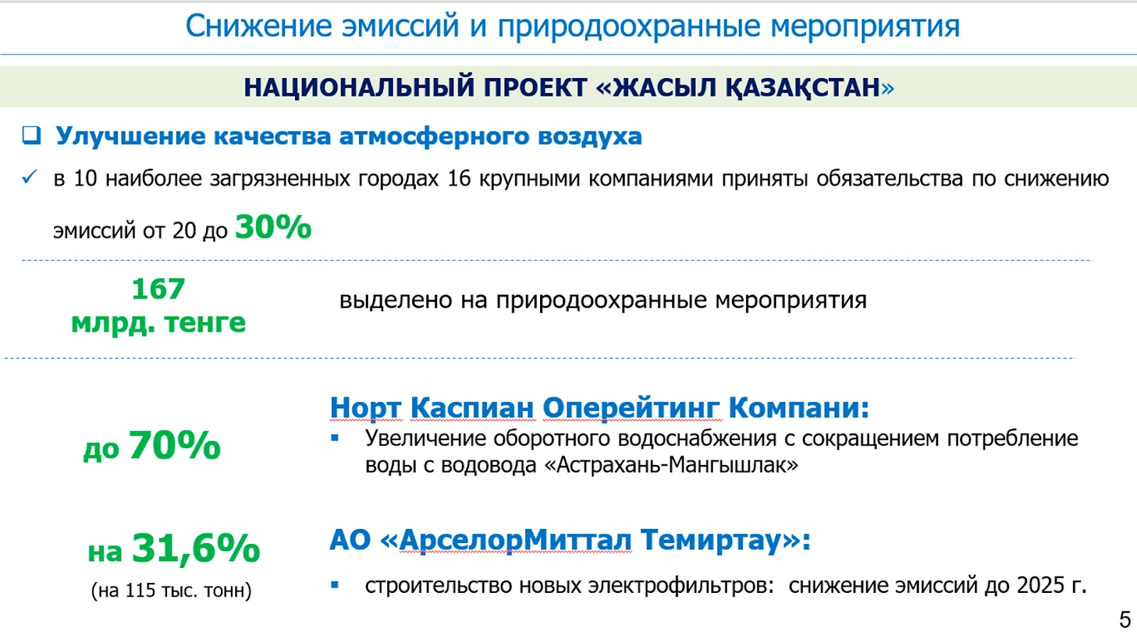 В Национальном проекте «Жасыл Казахстан» 16 крупными промышленными объектами приняты обязательства по снижению эмиссий от 20% до 30%. Предприятиями разработаны мероприятия по снижению эмиссий, позволяющие уже в 2022 году достичь нормативы эмиссии согласно нацплану.