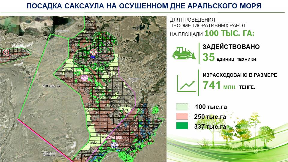 В рамках исполнения поручения Главы государства по посадке саксаульных насаждений на осушенном дне Арала в 2021 году выполнены фитолесомелиоративные работы на площади 100 тыс. га. В 2022 году запланировано проведение посева на площади 250 тыс.га.